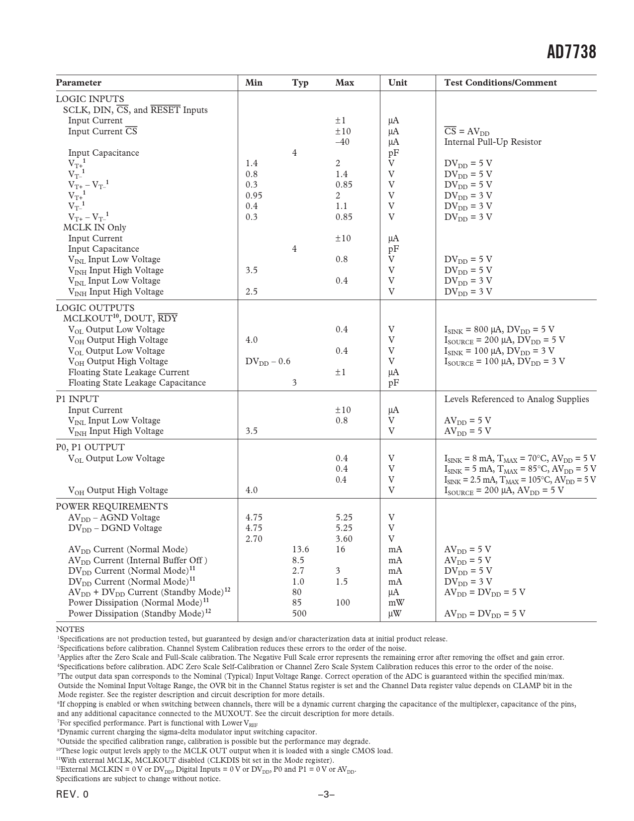 AD7738ParameterMinTypMaxUnitTest Conditions/Comment LOGIC INPUTS SCLK, DIN, CS, and RESET Inputs Input Current ±1 µA Input Current CS ±10 µA CS = AVDD –40 µA Internal Pull-Up Resistor Input Capacitance 4 pF V 1 T+ 1.4 2 V DVDD = 5 V V 1 T– 0.8 1.4 V DVDD = 5 V V 1 T+ – VT– 0.3 0.85 V DVDD = 5 V V 1 T+ 0.95 2 V DVDD = 3 V V 1 T– 0.4 1.1 V DVDD = 3 V V 1 T+ – VT– 0.3 0.85 V DVDD = 3 V MCLK IN Only Input Current ±10 µA Input Capacitance 4 pF VINL Input Low Voltage 0.8 V DVDD = 5 V VINH Input High Voltage 3.5 V DVDD = 5 V VINL Input Low Voltage 0.4 V DVDD = 3 V VINH Input High Voltage 2.5 V DVDD = 3 V LOGIC OUTPUTS MCLKOUT 10 , DOUT, RDY VOL Output Low Voltage 0.4 V ISINK = 800 µA, DVDD = 5 V VOH Output High Voltage 4.0 V ISOURCE = 200 µA, DVDD = 5 V VOL Output Low Voltage 0.4 V ISINK = 100 µA, DVDD = 3 V VOH Output High Voltage DVDD – 0.6 V ISOURCE = 100 µA, DVDD = 3 V Floating State Leakage Current ±1 µA Floating State Leakage Capacitance 3 pF P1 INPUT Levels Referenced to Analog Supplies Input Current ±10 µA VINL Input Low Voltage 0.8 V AVDD = 5 V VINH Input High Voltage 3.5 V AVDD = 5 V P0, P1 OUTPUT VOL Output Low Voltage 0.4 V ISINK = 8 mA, TMAX = 70°C, AVDD = 5 V 0.4 V ISINK = 5 mA, TMAX = 85°C, AVDD = 5 V 0.4 V ISINK = 2.5 mA, TMAX = 105°C, AVDD = 5 V VOH Output High Voltage 4.0 V ISOURCE = 200 µA, AVDD = 5 V POWER REQUIREMENTS AVDD – AGND Voltage 4.75 5.25 V DVDD – DGND Voltage 4.75 5.25 V 2.70 3.60 V AVDD Current (Normal Mode) 13.6 16 mA AVDD = 5 V AVDD Current (Internal Buffer Off ) 8.5 mA AVDD = 5 V DVDD Current (Normal Mode) 11 2.7 3 mA DVDD = 5 V DVDD Current (Normal Mode) 11 1.0 1.5 mA DVDD = 3 V AVDD + DVDD Current (Standby Mode) 12 80 µA AVDD = DVDD = 5 V Power Dissipation (Normal Mode) 11 85 100 mW Power Dissipation (Standby Mode) 12 500 µW AVDD = DVDD = 5 V NOTES 1Specifications are not production tested, but guaranteed by design and/or characterization data at initial product release. 2Specifications before calibration. Channel System Calibration reduces these errors to the order of the noise. 3Applies after the Zero Scale and Full-Scale calibration. The Negative Full Scale error represents the remaining error after removing the offset and gain error. 4Specifications before calibration. ADC Zero Scale Self-Calibration or Channel Zero Scale System Calibration reduces this error to the order of the noise. 5The output data span corresponds to the Nominal (Typical) Input Voltage Range. Correct operation of the ADC is guaranteed within the specified min/max. Outside the Nominal Input Voltage Range, the OVR bit in the Channel Status register is set and the Channel Data register value depends on CLAMP bit in the Mode register. See the register description and circuit description for more details. 6If chopping is enabled or when switching between channels, there will be a dynamic current charging the capacitance of the multiplexer, capacitance of the pins, and any additional capacitance connected to the MUXOUT. See the circuit description for more details. 7For specified performance. Part is functional with Lower VREF 8Dynamic current charging the sigma-delta modulator input switching capacitor. 9Outside the specified calibration range, calibration is possible but the performance may degrade. 10These logic output levels apply to the MCLK OUT output when it is loaded with a single CMOS load. 11With external MCLK, MCLKOUT disabled (CLKDIS bit set in the Mode register). 12External MCLKIN = 0 V or DV , Digital Inputs = 0 V or DV , P0 and P1 = 0 V or AV . DD DD DD Specifications are subject to change without notice. REV. 0 –3– Document Outline FEATURES APPLICATIONS GENERAL DESCRIPTION FUNCTIONAL BLOCK DIAGRAM SPECIFICATIONS TIMING SPECIFICATIONS ABSOLUTE MAXIMUM RATINGS ORDERING GUIDE PIN CONFIGURATION PIN FUNCTION DESCRIPTION PIN FUNCTION DESCRIPTION (continued) OUTPUT NOISE AND RESOLUTION SPECIFICATION CHOPPING ENABLED CHOPPING DISABLED Typical Performance Characteristics REGISTER DESCRIPTION Communications Register I/O Port Register Revision Register Test Register ADC Status Register Checksum Register ADC Zero Scale Calibration Register ADC Full-Scale Register Channel Data Registers Channel Zero-Scale Calibration Registers Channel Full-Scale Calibration Registers Channel Status Registers Channel Setup Registers Channel Conversion Time Registers Mode Register DIGITAL INTERFACE DESCRIPTION Hardware Reset Access the AD7738 Registers Single Conversion and Reading Data Dump Mode Continuous Conversion Mode Continuous Read (Continuous Conversion) Mode CIRCUIT DESCRIPTION Analog Front End Sigma-Delta ADC Chopping Multiplexer, Conversion, and Data Output Timing Frequency Response Analog Inputs Voltage Range Analog Inputs Extended Voltage Range Voltage Reference Inputs Reference Detect I/O Port CALIBRATION ADC Zero-Scale Self-Calibration Per Channel System Calibration OUTLINE DIMENSIONS