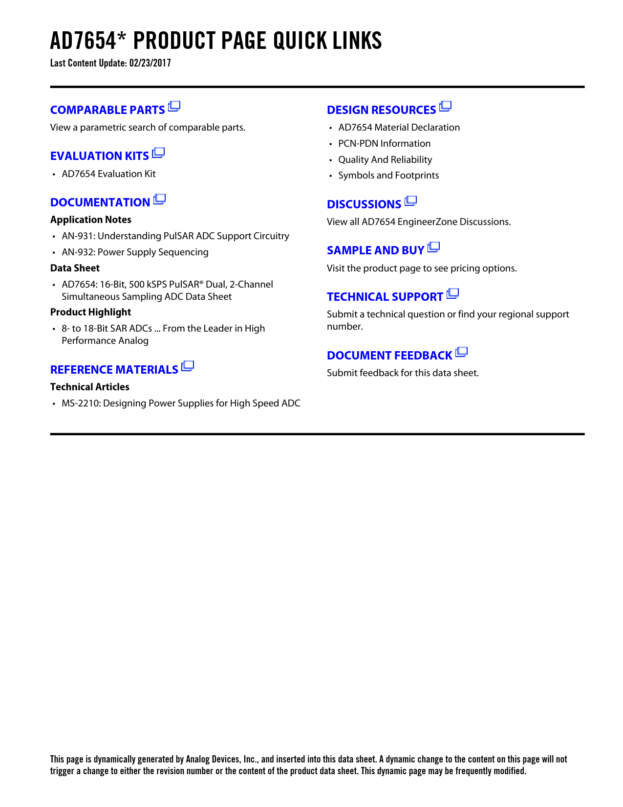 AD7654* PRODUCT PAGE QUICK LINKS Last Content Update: 02/23/2017COMPARABLE PARTSDESIGN RESOURCES View a parametric search of comparable parts. • AD7654 Material Declaration • PCN-PDN Information EVALUATION KITS • Quality And Reliability • AD7654 Evaluation Kit • Symbols and Footprints DOCUMENTATIONDISCUSSIONSApplication Notes View all AD7654 EngineerZone Discussions. • AN-931: Understanding PulSAR ADC Support Circuitry • AN-932: Power Supply Sequencing SAMPLE AND BUYData Sheet Visit the product page to see pricing options. • AD7654: 16-Bit, 500 kSPS PulSAR® Dual, 2-Channel Simultaneous Sampling ADC Data Sheet TECHNICAL SUPPORTProduct Highlight Submit a technical question or find your regional support • 8- to 18-Bit SAR ADCs ... From the Leader in High number. Performance Analog DOCUMENT FEEDBACKREFERENCE MATERIALS Submit feedback for this data sheet. Technical Articles • MS-2210: Designing Power Supplies for High Speed ADC This page is dynamically generated by Analog Devices, Inc., and inserted into this data sheet. A dynamic change to the content on this page will not trigger a change to either the revision number or the content of the product data sheet. This dynamic page may be frequently modified. Document Outline FEATURES APPLICATIONS GENERAL DESCRIPTION FUNCTIONAL BLOCK DIAGRAM PRODUCT HIGHLIGHTS TABLE OF CONTENTS REVISION HISTORY SPECIFICATIONS TIMING SPECIFICATIONS ABSOLUTE MAXIMUM RATINGS ESD CAUTION PIN CONFIGURATIONS AND FUNCTION DESCRIPTIONS TERMINOLOGY TYPICAL PERFORMANCE CHARACTERISTICS APPLICATIONS INFORMATION CIRCUIT INFORMATION MODES OF OPERATION TRANSFER FUNCTIONS TYPICAL CONNECTION DIAGRAM ANALOG INPUTS INPUT CHANNEL MULTIPLEXER DRIVER AMPLIFIER CHOICE VOLTAGE REFERENCE INPUT POWER SUPPLY POWER DISSIPATION CONVERSION CONTROL DIGITAL INTERFACE PARALLEL INTERFACE Master Parallel Interface Slave Parallel Interface 8-Bit Interface (Master or Slave) Channel A//B Output SERIAL INTERFACE MASTER SERIAL INTERFACE Internal Clock SLAVE SERIAL INTERFACE External Clock External Discontinuous Clock Data Read After Convert External Clock Data Read Previous During Convert MICROPROCESSOR INTERFACING SPI INTERFACE (ADSP-2191M) APPLICATION HINTS LAYOUT OUTLINE DIMENSIONS ORDERING GUIDE