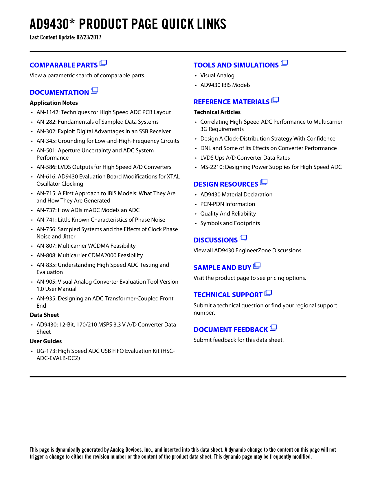 AD9430* PRODUCT PAGE QUICK LINKS Last Content Update: 02/23/2017COMPARABLE PARTSTOOLS AND SIMULATIONS View a parametric search of comparable parts. • Visual Analog • AD9430 IBIS Models DOCUMENTATIONApplication NotesREFERENCE MATERIALS • AN-1142: Techniques for High Speed ADC PCB Layout Technical Articles • AN-282: Fundamentals of Sampled Data Systems • Correlating High-Speed ADC Performance to Multicarrier • AN-302: Exploit Digital Advantages in an SSB Receiver 3G Requirements • AN-345: Grounding for Low-and-High-Frequency Circuits • Design A Clock-Distribution Strategy With Confidence • AN-501: Aperture Uncertainty and ADC System • DNL and Some of its Effects on Converter Performance Performance • LVDS Ups A/D Converter Data Rates • AN-586: LVDS Outputs for High Speed A/D Converters • MS-2210: Designing Power Supplies for High Speed ADC • AN-616: AD9430 Evaluation Board Modifications for XTAL Oscillator Clocking DESIGN RESOURCES • AN-715: A First Approach to IBIS Models: What They Are • AD9430 Material Declaration and How They Are Generated • PCN-PDN Information • AN-737: How ADIsimADC Models an ADC • Quality And Reliability • AN-741: Little Known Characteristics of Phase Noise • Symbols and Footprints • AN-756: Sampled Systems and the Effects of Clock Phase Noise and Jitter DISCUSSIONS • AN-807: Multicarrier WCDMA Feasibility View all AD9430 EngineerZone Discussions. • AN-808: Multicarrier CDMA2000 Feasibility • AN-835: Understanding High Speed ADC Testing and SAMPLE AND BUY Evaluation Visit the product page to see pricing options. • AN-905: Visual Analog Converter Evaluation Tool Version 1.0 User Manual TECHNICAL SUPPORT • AN-935: Designing an ADC Transformer-Coupled Front End Submit a technical question or find your regional support Data Sheet number. • AD9430: 12-Bit, 170/210 MSPS 3.3 V A/D Converter Data Sheet DOCUMENT FEEDBACKUser Guides Submit feedback for this data sheet. • UG-173: High Speed ADC USB FIFO Evaluation Kit (HSC- ADC-EVALB-DCZ) This page is dynamically generated by Analog Devices, Inc., and inserted into this data sheet. A dynamic change to the content on this page will not trigger a change to either the revision number or the content of the product data sheet. This dynamic page may be frequently modified. Document Outline FEATURES FUNCTIONAL BLOCK DIAGRAM GENERAL DESCRIPTION APPLICATIONS TABLE OF CONTENTS DC SPECIFICATIONS AC SPECIFICATIONS DIGITAL SPECIFICATIONS SWITCHING SPECIFICATIONS TIMING DIAGRAMS ABSOLUTE MAXIMUM RATINGS EXPLANATION OF TEST LEVELS ESD CAUTION PIN CONFIGURATIONS AND FUNCTION DESCRIPTIONS EQUIVALENT CIRCUITS TYPICAL PERFORMANCE CHARACTERISTICS TERMINOLOGY APPLICATION NOTES THEORY OF OPERATION ENCODE INPUT ANALOG INPUT DS INPUTS (DS+, DS–) CMOS OUTPUTS LVDS OUTPUTS VOLTAGE REFERENCE NOISE POWER RATIO TESTING (NPR) EVALUATION BOARD, CMOS MODE POWER CONNECTOR ANALOG INPUTS GAIN ENCODE VOLTAGE REFERENCE DATA FORMAT SELECT I/P TIMING SELECT TIMING CONTROLS CMOS DATA OUTPUTS CRYSTAL OSCILLATOR OPTIONAL AMPLIFIER TROUBLESHOOTING EVALUATION BOARD, LVDS MODE POWER CONNECTOR ANALOG INPUTS GAIN CLOCK VOLTAGE REFERENCE DATA FORMAT SELECT DATA OUTPUTS CRYSTAL OSCILLATOR OUTLINE DIMENSIONS ORDERING GUIDE