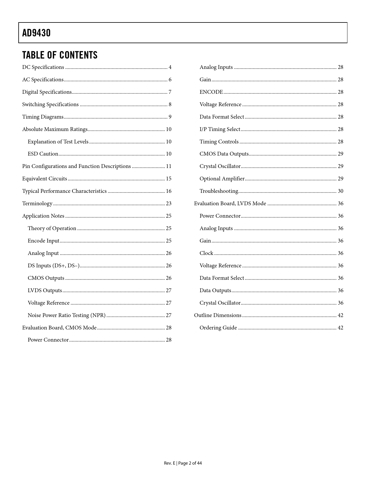 link to page 5 link to page 7 link to page 8 link to page 9 link to page 10 link to page 11 link to page 11 link to page 11 link to page 12 link to page 16 link to page 17 link to page 24 link to page 26 link to page 26 link to page 26 link to page 27 link to page 27 link to page 27 link to page 28 link to page 28 link to page 28 link to page 29 link to page 29 link to page 29 link to page 29 link to page 29 link to page 29 link to page 29 link to page 29 link to page 29 link to page 30 link to page 30 link to page 30 link to page 31 link to page 37 link to page 37 link to page 37 link to page 37 link to page 37 link to page 37 link to page 37 link to page 37 link to page 37 link to page 43 link to page 43 AD9430TABLE OF CONTENTS DC Specifications ... 4 Analog Inputs ... 28 AC Specifications.. 6 Gain.. 28 Digital Specifications.. 7 ENCODE... 28 Switching Specifications .. 8 Voltage Reference ... 28 Timing Diagrams.. 9 Data Format Select ... 28 Absolute Maximum Ratings.. 10 I/P Timing Select.. 28 Explanation of Test Levels ... 10 Timing Controls ... 28 ESD Caution.. 10 CMOS Data Outputs.. 29 Pin Configurations and Function Descriptions ... 11 Crystal Oscillator.. 29 Equivalent Circuits ... 15 Optional Amplifier... 29 Typical Performance Characteristics ... 16 Troubleshooting.. 30 Terminology .. 23 Evaluation Board, LVDS Mode .. 36 Application Notes ... 25 Power Connector.. 36 Theory of Operation .. 25 Analog Inputs ... 36 Encode Input... 25 Gain.. 36 Analog Input ... 26 Clock .. 36 DS Inputs (DS+, DS–).. 26 Voltage Reference ... 36 CMOS Outputs ... 26 Data Format Select ... 36 LVDS Outputs... 27 Data Outputs... 36 Voltage Reference ... 27 Crystal Oscillator.. 36 Noise Power Ratio Testing (NPR) .. 27 Outline Dimensions ... 42 Evaluation Board, CMOS Mode... 28 Ordering Guide .. 42 Power Connector.. 28 Rev. E | Page 2 of 44 Document Outline FEATURES FUNCTIONAL BLOCK DIAGRAM GENERAL DESCRIPTION APPLICATIONS TABLE OF CONTENTS DC SPECIFICATIONS AC SPECIFICATIONS DIGITAL SPECIFICATIONS SWITCHING SPECIFICATIONS TIMING DIAGRAMS ABSOLUTE MAXIMUM RATINGS EXPLANATION OF TEST LEVELS ESD CAUTION PIN CONFIGURATIONS AND FUNCTION DESCRIPTIONS EQUIVALENT CIRCUITS TYPICAL PERFORMANCE CHARACTERISTICS TERMINOLOGY APPLICATION NOTES THEORY OF OPERATION ENCODE INPUT ANALOG INPUT DS INPUTS (DS+, DS–) CMOS OUTPUTS LVDS OUTPUTS VOLTAGE REFERENCE NOISE POWER RATIO TESTING (NPR) EVALUATION BOARD, CMOS MODE POWER CONNECTOR ANALOG INPUTS GAIN ENCODE VOLTAGE REFERENCE DATA FORMAT SELECT I/P TIMING SELECT TIMING CONTROLS CMOS DATA OUTPUTS CRYSTAL OSCILLATOR OPTIONAL AMPLIFIER TROUBLESHOOTING EVALUATION BOARD, LVDS MODE POWER CONNECTOR ANALOG INPUTS GAIN CLOCK VOLTAGE REFERENCE DATA FORMAT SELECT DATA OUTPUTS CRYSTAL OSCILLATOR OUTLINE DIMENSIONS ORDERING GUIDE