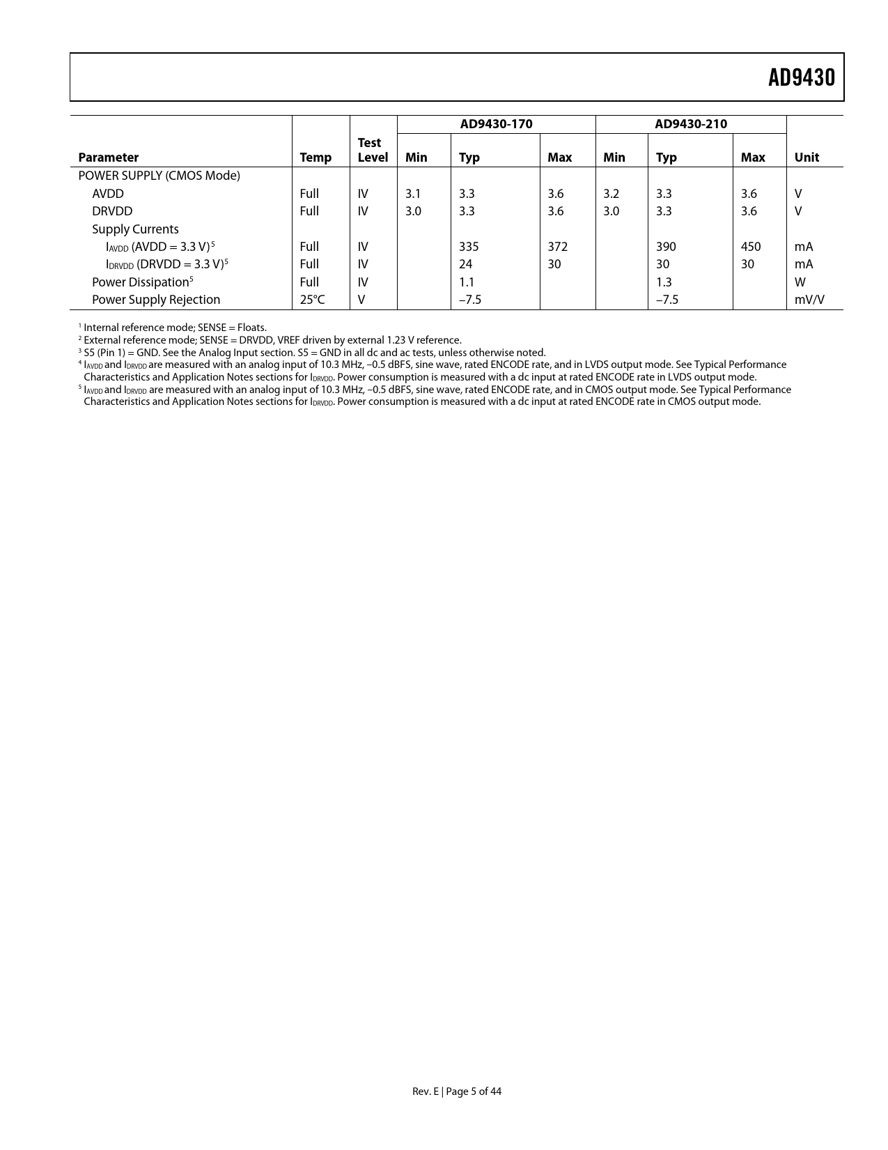 link to page 45 link to page 6 link to page 6 link to page 6 link to page 6 link to page 6 link to page 27 AD9430AD9430-170AD9430-210TestParameterTempLevelMinTypMaxMinTypMaxUnit POWER SUPPLY (CMOS Mode) AVDD Full IV 3.1 3.3 3.6 3.2 3.3 3.6 V DRVDD Full IV 3.0 3.3 3.6 3.0 3.3 3.6 V Supply Currents IAVDD (AVDD = 3.3 V)5 Full IV 335 372 390 450 mA IDRVDD (DRVDD = 3.3 V)5 Full IV 24 30 30 30 mA Power Dissipation5 Full IV 1.1 1.3 W Power Supply Rejection 25°C V –7.5 –7.5 mV/V 1 Internal reference mode; SENSE = Floats. 2 External reference mode; SENSE = DRVDD, VREF driven by external 1.23 V reference. 3 S5 (Pin 1) = GND. See the Analog Inpu sect t ion. S5 = GND in all dc and ac tests, unless otherwise noted. 4 IAVDD and IDRVDD are measured with an analog input of 10.3 MHz, –0.5 dBFS, sine wave, rated ENCODE rate, and in LVDS output mode. See Typical Performance Characteristics and Application Notes sections for IDRVDD. Power consumption is measured with a dc input at rated ENCODE rate in LVDS output mode. 5 IAVDD and IDRVDD are measured with an analog input of 10.3 MHz, –0.5 dBFS, sine wave, rated ENCODE rate, and in CMOS output mode. See Typical Performance Characteristics and Application Notes sections for IDRVDD. Power consumption is measured with a dc input at rated ENCODE rate in CMOS output mode. Rev. E | Page 5 of 44 Document Outline FEATURES FUNCTIONAL BLOCK DIAGRAM GENERAL DESCRIPTION APPLICATIONS TABLE OF CONTENTS DC SPECIFICATIONS AC SPECIFICATIONS DIGITAL SPECIFICATIONS SWITCHING SPECIFICATIONS TIMING DIAGRAMS ABSOLUTE MAXIMUM RATINGS EXPLANATION OF TEST LEVELS ESD CAUTION PIN CONFIGURATIONS AND FUNCTION DESCRIPTIONS EQUIVALENT CIRCUITS TYPICAL PERFORMANCE CHARACTERISTICS TERMINOLOGY APPLICATION NOTES THEORY OF OPERATION ENCODE INPUT ANALOG INPUT DS INPUTS (DS+, DS–) CMOS OUTPUTS LVDS OUTPUTS VOLTAGE REFERENCE NOISE POWER RATIO TESTING (NPR) EVALUATION BOARD, CMOS MODE POWER CONNECTOR ANALOG INPUTS GAIN ENCODE VOLTAGE REFERENCE DATA FORMAT SELECT I/P TIMING SELECT TIMING CONTROLS CMOS DATA OUTPUTS CRYSTAL OSCILLATOR OPTIONAL AMPLIFIER TROUBLESHOOTING EVALUATION BOARD, LVDS MODE POWER CONNECTOR ANALOG INPUTS GAIN CLOCK VOLTAGE REFERENCE DATA FORMAT SELECT DATA OUTPUTS CRYSTAL OSCILLATOR OUTLINE DIMENSIONS ORDERING GUIDE