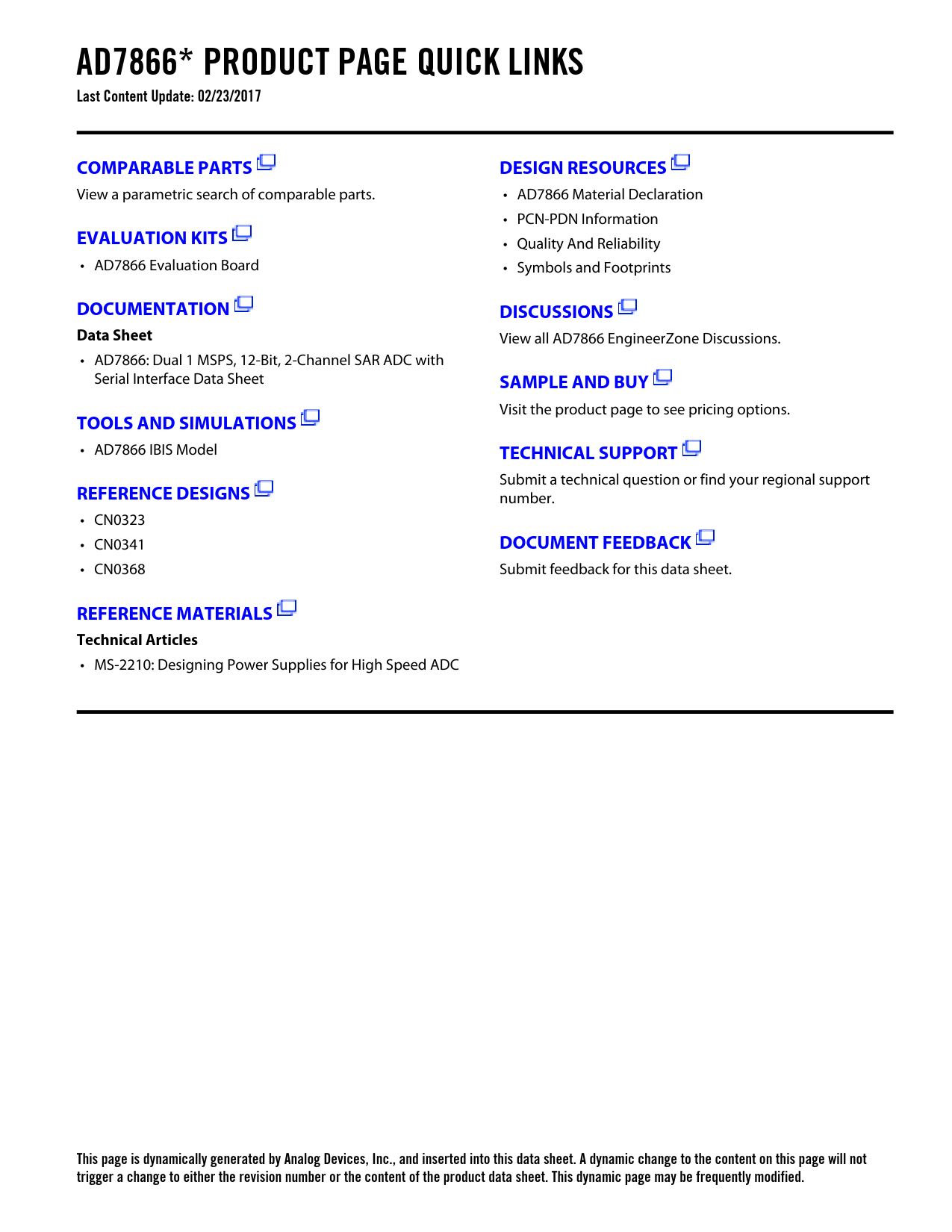 AD7866* PRODUCT PAGE QUICK LINKS Last Content Update: 02/23/2017. COMPARABLE PARTS. DESIGN RESOURCES. EVALUATION KITS