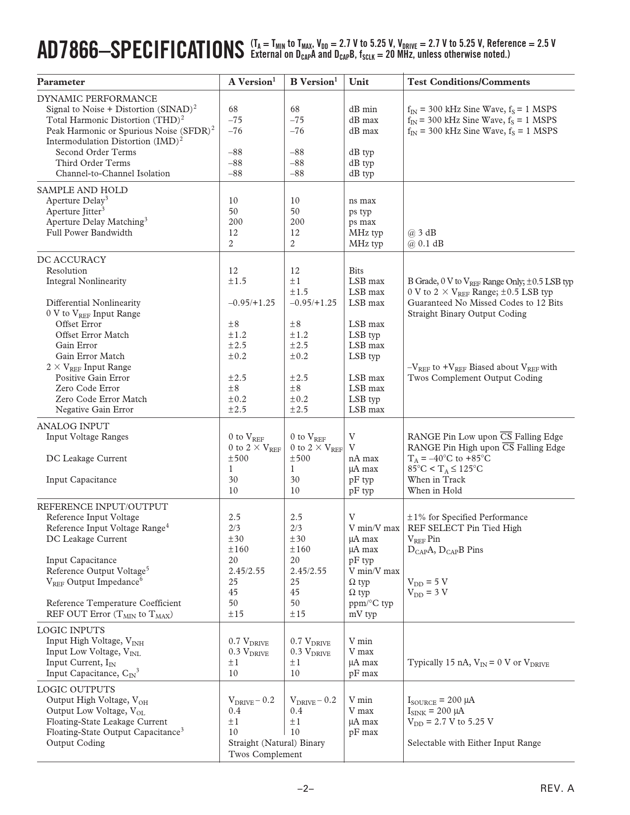 AD7866–SPECIFICATIONS (TA = TMIN to TMAX, VDD = 2.7 V to 5.25 V, VDRIVE = 2.7 V to 5.25 V, Reference = 2.5 V External on DCAPA and DCAPB, fSCLK = 20 MHz, unless otherwise noted.) Parameter A Version1 B Version1 Unit Test Conditions/Comments