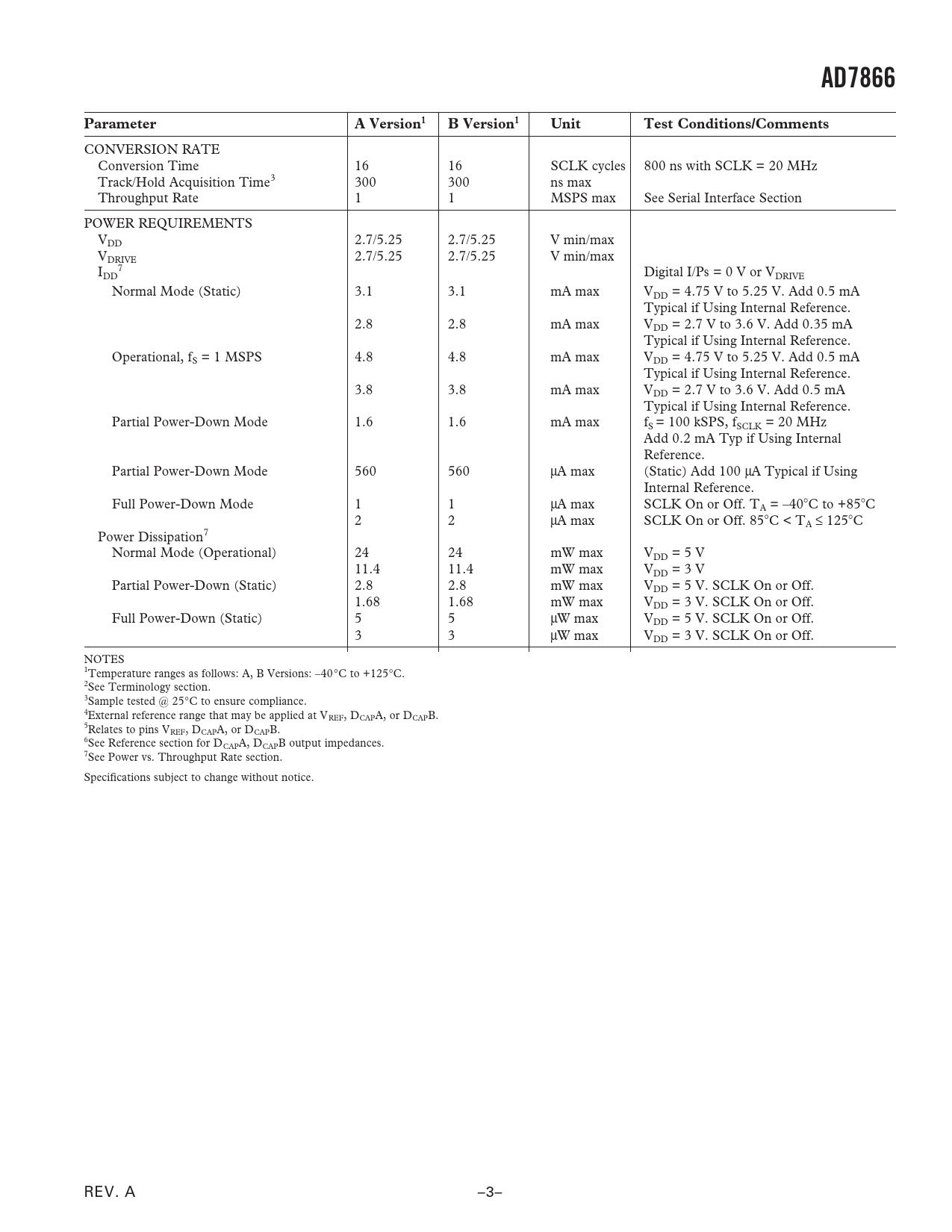 AD7866ParameterA Version1B Version1UnitTest Conditions/Comments CONVERSION RATE Conversion Time 16 16 SCLK cycles 800 ns with SCLK = 20 MHz Track/Hold Acquisition Time3 300 300 ns max Throughput Rate 1 1 MSPS max See Serial Interface Section POWER REQUIREMENTS VDD 2.7/5.25 2.7/5.25 V min/max VDRIVE 2.7/5.25 2.7/5.25 V min/max I 7 DD Digital I/Ps = 0 V or VDRIVE Normal Mode (Static) 3.1 3.1 mA max VDD = 4.75 V to 5.25 V. Add 0.5 mA Typical if Using Internal Reference. 2.8 2.8 mA max VDD = 2.7 V to 3.6 V. Add 0.35 mA Typical if Using Internal Reference. Operational, fS = 1 MSPS 4.8 4.8 mA max VDD = 4.75 V to 5.25 V. Add 0.5 mA Typical if Using Internal Reference. 3.8 3.8 mA max VDD = 2.7 V to 3.6 V. Add 0.5 mA Typical if Using Internal Reference. Partial Power-Down Mode 1.6 1.6 mA max fS = 100 kSPS, fSCLK = 20 MHz Add 0.2 mA Typ if Using Internal Reference. Partial Power-Down Mode 560 560 µA max (Static) Add 100 µA Typical if Using Internal Reference. Full Power-Down Mode 1 1 µA max SCLK On or Off. TA = –40C to +85C 2 2 µA max SCLK On or Off. 85C < TA ≤ 125C Power Dissipation7 Normal Mode (Operational) 24 24 mW max VDD = 5 V 11.4 11.4 mW max VDD = 3 V Partial Power-Down (Static) 2.8 2.8 mW max VDD = 5 V. SCLK On or Off. 1.68 1.68 mW max VDD = 3 V. SCLK On or Off. Full Power-Down (Static) 5 5 µW max VDD = 5 V. SCLK On or Off. 3 3 µW max VDD = 3 V. SCLK On or Off. NOTES 1Temperature ranges as follows: A, B Versions: –40°C to +125°C. 2See Terminology section. 3Sample tested @ 25°C to ensure compliance. 4External reference range that may be applied at VREF, DCAPA, or DCAPB. 5Relates to pins VREF, DCAPA, or DCAPB. 6See Reference section for DCAPA, DCAPB output impedances. 7See Power vs. Throughput Rate section. Specifications subject to change without notice. REV. A –3– Document Outline FEATURES GENERAL DESCRIPTION PRODUCT HIGHLIGHTS FUNCTIONAL BLOCK DIAGRAM SPECIFICATIONS TIMING SPECIFICATIONS ABSOLUTE MAXIMUM RATINGS ORDERING GUIDE PIN CONFIGURATION PIN FUNCTION DESCRIPTIONS TERMINOLOGY Integral Nonlinearity Differential Nonlinearity Offset Error Offset Error Match Gain Error Gain Error Match Zero Code Error Zero Code Error Match Positive Gain Error Negative Gain Error Track-and-Hold Acquisition Time Signal-to-(Noise + Distortion) Ratio (SNDR) Total Harmonic Distortion (THD) Peak Harmonic or Spurious Noise Intermodulation Distortion Channel-to-Channel Isolation PSR (Power Supply Rejection) PERFORMANCE CURVES Typical Performance Characteristics CIRCUIT INFORMATION CONVERTER OPERATION ANALOG INPUT Analog Input Ranges Handling Bipolar Input Signals Transfer Functions Digital Inputs REFERENCE CONFIGURATION OPTIONS MODES OF OPERATION Normal Mode Partial Power-Down Mode Full Power-Down Mode POWER-UP TIMES POWER VS. THROUGHPUT RATE SERIAL INTERFACE MICROPROCESSOR INTERFACING AD7866 to ADSP-218x AD7866 to TMS320C541 AD7866 to DSP-563xx APPLICATION HINTS Grounding and Layout Evaluating the AD7866 Performance OUTLINE DIMENSIONS Revision History