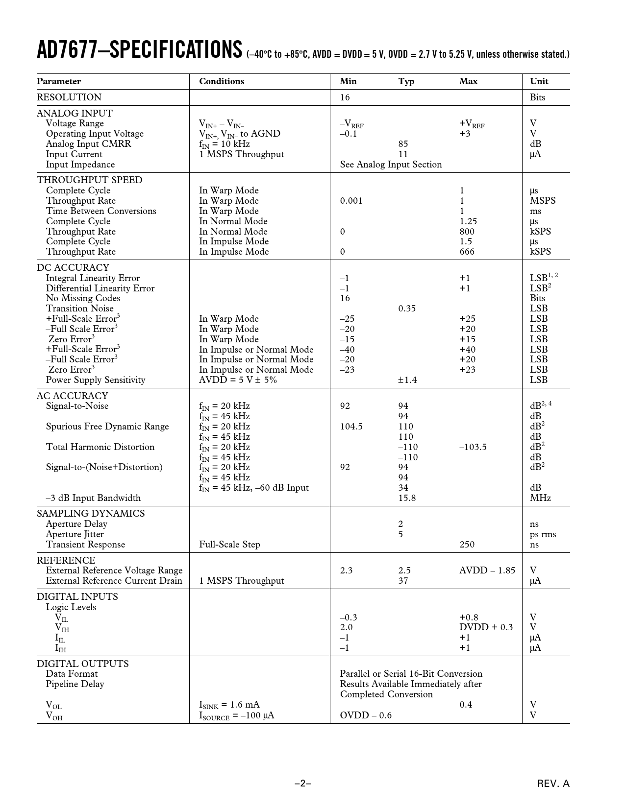 AD7677–SPECIFICATIONS (–40C to +85C, AVDD = DVDD = 5 V, OVDD = 2.7 V to 5.25 V, unless otherwise stated.)ParameterConditionsMinTypMaxUnit RESOLUTION 16 Bits ANALOG INPUT Voltage Range VIN+ – VIN– –VREF +VREF V Operating Input Voltage VIN+, VIN– to AGND –0.1 +3 V Analog Input CMRR fIN = 10 kHz 85 dB Input Current 1 MSPS Throughput 11 µA Input Impedance See Analog Input Section THROUGHPUT SPEED Complete Cycle In Warp Mode 1 µs Throughput Rate In Warp Mode 0.001 1 MSPS Time Between Conversions In Warp Mode 1 ms Complete Cycle In Normal Mode 1.25 µs Throughput Rate In Normal Mode 0 800 kSPS Complete Cycle In Impulse Mode 1.5 µs Throughput Rate In Impulse Mode 0 666 kSPS DC ACCURACY Integral Linearity Error –1 +1 LSB1, 2 Differential Linearity Error –1 +1 LSB2 No Missing Codes 16 Bits Transition Noise 0.35 LSB +Full-Scale Error3 In Warp Mode –25 +25 LSB –Full Scale Error3 In Warp Mode –20 +20 LSB Zero Error3 In Warp Mode –15 +15 LSB +Full-Scale Error3 In Impulse or Normal Mode –40 +40 LSB –Full Scale Error3 In Impulse or Normal Mode –20 +20 LSB Zero Error3 In Impulse or Normal Mode –23 +23 LSB Power Supply Sensitivity AVDD = 5 V ± 5% ±1.4 LSB AC ACCURACY Signal-to-Noise fIN = 20 kHz 92 94 dB2, 4 fIN = 45 kHz 94 dB Spurious Free Dynamic Range fIN = 20 kHz 104.5 110 dB2 fIN = 45 kHz 110 dB Total Harmonic Distortion fIN = 20 kHz –110 –103.5 dB2 fIN = 45 kHz –110 dB Signal-to-(Noise+Distortion) fIN = 20 kHz 92 94 dB2 fIN = 45 kHz 94 fIN = 45 kHz, –60 dB Input 34 dB –3 dB Input Bandwidth 15.8 MHz SAMPLING DYNAMICS Aperture Delay 2 ns Aperture Jitter 5 ps rms Transient Response Full-Scale Step 250 ns REFERENCE External Reference Voltage Range 2.3 2.5 AVDD – 1.85 V External Reference Current Drain 1 MSPS Throughput 37 µA DIGITAL INPUTS Logic Levels VIL –0.3 +0.8 V VIH 2.0 DVDD + 0.3 V IIL –1 +1 µA IIH –1 +1 µA DIGITAL OUTPUTS Data Format Parallel or Serial 16-Bit Conversion Pipeline Delay Results Available Immediately after Completed Conversion VOL ISINK = 1.6 mA 0.4 V VOH ISOURCE = –100 µA OVDD – 0.6 V –2– REV. A Document Outline FEATURES APPLICATIONS FUNCTIONAL BLOCK DIAGRAM PulSAR Selection GENERAL DESCRIPTION PRODUCT HIGHLIGHTS SPECIFICATIONS Table I. Serial Clock Timings in Master Read after Convert ABSOLUTE MAXIMUM RATINGS ORDERING GUIDE PIN FUNCTION DESCRIPTIONS PIN CONFIGURATION Typical Performance Characteristics CIRCUIT INFORMATION CONVERTER OPERATION Modes of Operation Transfer Functions TYPICAL CONNECTION DIAGRAM Analog Inputs Single to Differential Driver Driver Amplifier Choice Voltage Reference Input Power Supply POWER DISSIPATION CONVERSION CONTROL DIGITAL INTERFACE PARALLEL INTERFACE SERIAL INTERFACE MASTER SERIAL INTERFACE Internal Clock SLAVE SERIAL INTERFACE External Clock External Discontinuous Clock Data Read after Conversion External Clock Data Read During Conversion MICROPROCESSOR INTERFACING SPI Interface (MC68HC11) ADSP-21065L in Master Serial Interface APPLICATION HINTS Layout Evaluating the AD7677 Performance OUTLINE DIMENSIONS Revision History
