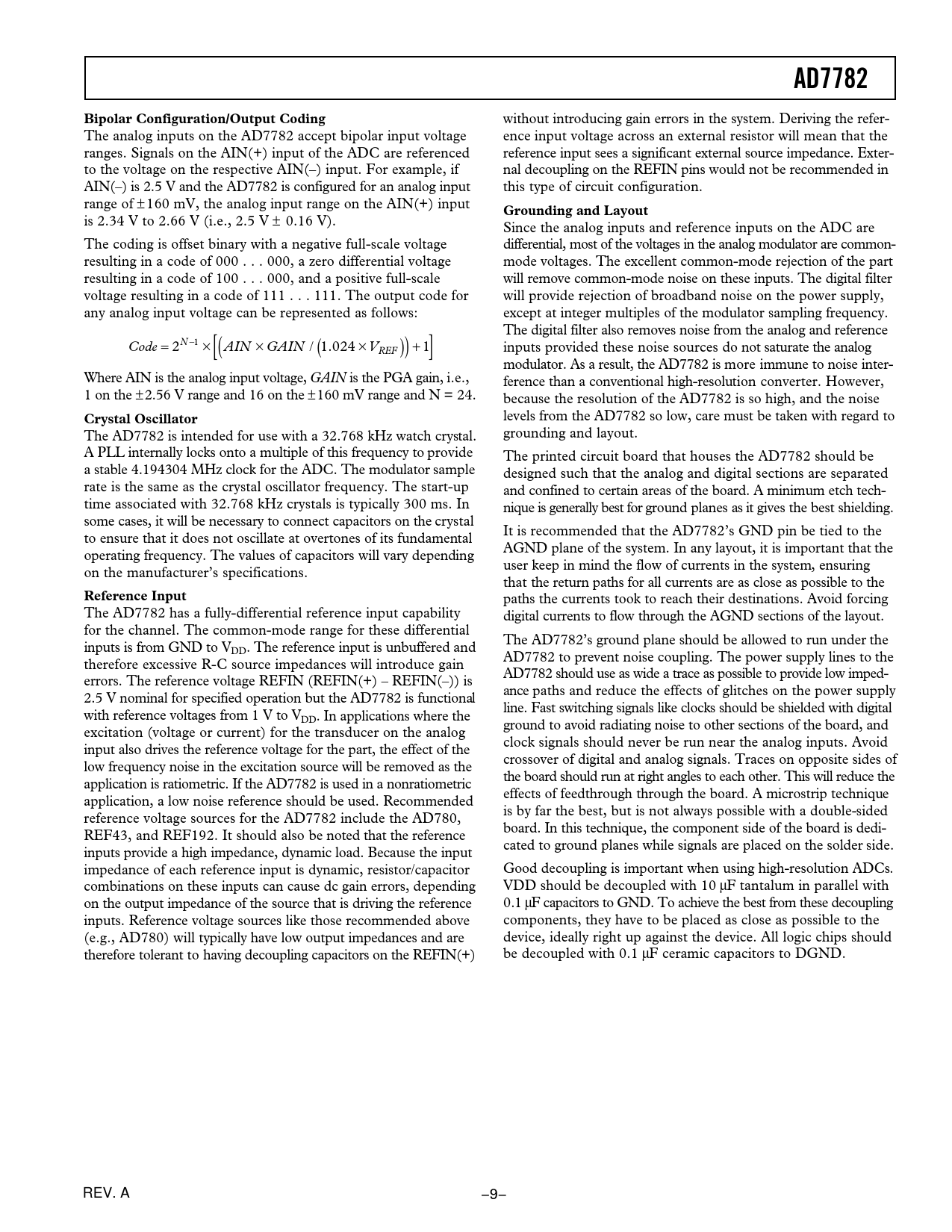 AD7782. Bipolar Configuration/Output Coding. Grounding and Layout. Crystal Oscillator. Reference Input