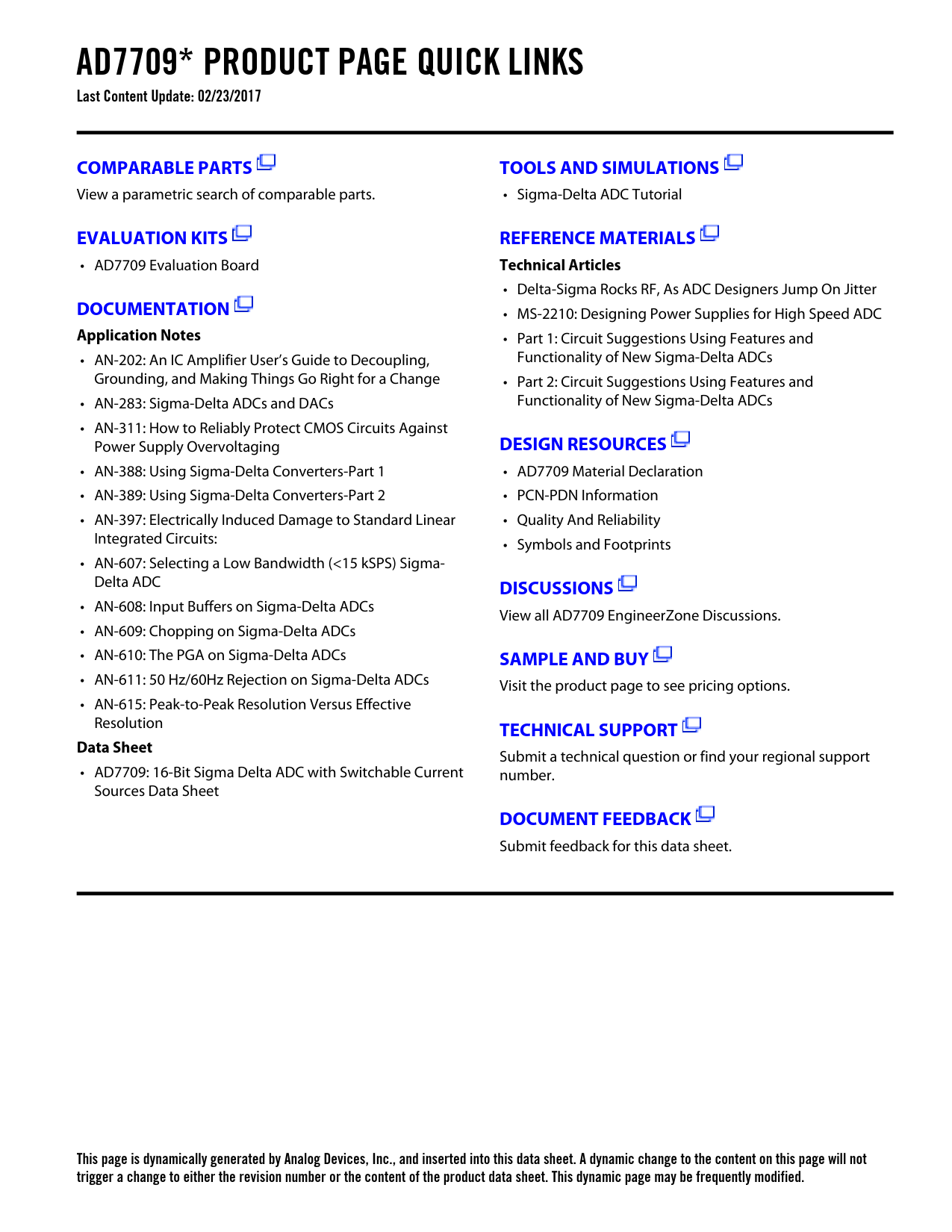 AD7709* PRODUCT PAGE QUICK LINKS Last Content Update: 02/23/2017. COMPARABLE PARTS. TOOLS AND SIMULATIONS. EVALUATION KITS