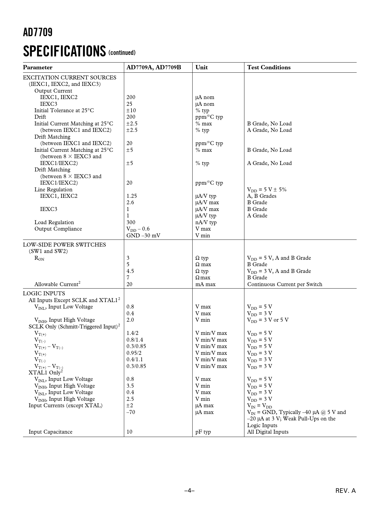 AD7709 (continued) SPECIFICATIONS Parameter AD7709A, AD7709B Unit Test Conditions