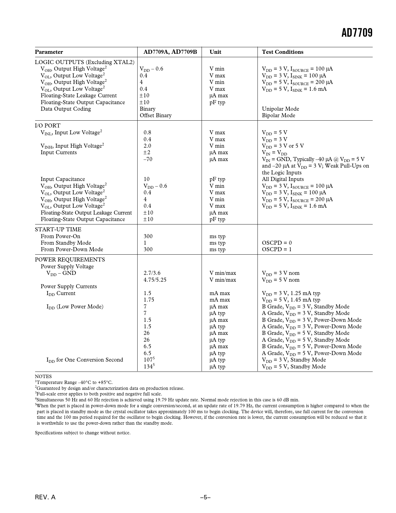 AD7709ParameterAD7709A, AD7709BUnitTest Conditions LOGIC OUTPUTS (Excluding XTAL2) VOH, Output High Voltage2 VDD – 0.6 V min VDD = 3 V, ISOURCE = 100 mA VOL, Output Low Voltage2 0.4 V max VDD = 3 V, ISINK = 100 mA VOH, Output High Voltage2 4 V min VDD = 5 V, ISOURCE = 200 mA VOL, Output Low Voltage2 0.4 V max VDD = 5 V, ISINK = 1.6 mA Floating-State Leakage Current ±10 mA max Floating-State Output Capacitance ±10 pF typ Data Output Coding Binary Unipolar Mode Offset Binary Bipolar Mode I/O PORT VINL, Input Low Voltage2 0.8 V max VDD = 5 V 0.4 V max VDD = 3 V VINH, Input High Voltage2 2.0 V min VDD = 3 V or 5 V Input Currents ±2 mA max VIN = VDD –70 mA max VIN = GND, Typically –40 mA @ VDD = 5 V and –20 mA at VDD = 3 V; Weak Pull-Ups on the Logic Inputs Input Capacitance 10 pF typ All Digital Inputs VOH, Output High Voltage2 VDD – 0.6 V min VDD = 3 V, ISOURCE = 100 mA VOL, Output Low Voltage2 0.4 V max VDD = 3 V, ISINK = 100 mA VOH, Output High Voltage2 4 V min VDD = 5 V, ISOURCE = 200 mA VOL, Output Low Voltage2 0.4 V max VDD = 5 V, ISINK = 1.6 mA Floating-State Output Leakage Current ±10 mA max Floating-State Output Capacitance ±10 pF typ START-UP TIME From Power-On 300 ms typ From Standby Mode 1 ms typ OSCPD = 0 From Power-Down Mode 300 ms typ OSCPD = 1 POWER REQUIREMENTS Power Supply Voltage VDD – GND 2.7/3.6 V min/max VDD = 3 V nom 4.75/5.25 V min/max VDD = 5 V nom Power Supply Currents IDD Current 1.5 mA max VDD = 3 V, 1.25 mA typ 1.75 mA max VDD = 5 V, 1.45 mA typ IDD (Low Power Mode) 7 mA max B Grade, VDD = 3 V, Standby Mode 7 mA typ A Grade, VDD = 3 V, Standby Mode 1.5 mA max B Grade, VDD = 3 V, Power-Down Mode 1.5 mA typ A Grade, VDD = 3 V, Power-Down Mode 26 mA max B Grade, VDD = 5 V, Standby Mode 26 mA typ A Grade, VDD = 5 V, Standby Mode 6.5 mA max B Grade, VDD = 5 V, Power-Down Mode 6.5 mA typ A Grade, VDD = 5 V, Power-Down Mode IDD for One Conversion Second 1075 mA typ VDD = 3 V, Standby Mode 1345 mA typ VDD = 5 V, Standby Mode NOTES 1Temperature Range –40∞C to +85∞C. 2Guaranteed by design and/or characterization data on production release. 3Full-scale error applies to both positive and negative full scale. 4Simultaneous 50 Hz and 60 Hz rejection is achieved using 19.79 Hz update rate. Normal mode rejection in this case is 60 dB min. 5When the part is placed in power-down mode for a single conversion/second, at an update rate of 19.79 Hz, the current consumption is higher compared to when the part is placed in standby mode as the crystal oscillator takes approximately 100 ms to begin clocking. The device will, therefore, use full current for the conversion time and the 100 ms period required for the oscillator to begin clocking. However, if the conversion rate is lower, the current consumption will be reduced so that it is worthwhile to use the power-down rather than the standby mode. Specifications subject to change without notice. REV. A –5– Document Outline FEATURES INTERFACE POWER ON-CHIP FUNCTIONS APPLICATIONS GENERAL DESCRIPTION FUNCTIONAL BLOCK DIAGRAM TABLE OF CONTENTS SPECIFICATIONS TIMING CHARACTERISTICS ABSOLUTE MAXIMUM RATINGS PIN CONFIGURATION ORDERING GUIDE PIN FUNCTION DESCRIPTIONS Typical Performance Characteristics ADC CIRCUIT INFORMATION Overview Sigma-Delta ADC NOISE PERFORMANCE ON-CHIP REGISTERS Communications Register (A1, A0 = 0, 0) Status Register (A1, A0 = 0, 0; Power-On-Reset = 00H) Configuration Register (A1, A0 = 0, 1; Power-On-Reset = 000007H) Filter Register (A1, A0 = 1, 0; Power-On-Reset = 45h) ADC Data Result Register (A1, A0 = 1, 1; Power-On-Reset = 0000h CONFIGURING THE AD7709 DIGITAL INTERFACE MICROCOMPUTER/MICROPROCESSOR INTERFACING AD7709-to-68HC11 Interface AD7709-to-8051 Interface AD7709-to-ADSP-2103/ADSP-2105 Interface CIRCUIT DESCRIPTION Analog Input Channels Programmable Gain Amplifier Bipolar/Unipolar Configuration Data Output Coding Excitation Currents Crystal Oscillator Reference Input Reset Input Power-Down Mode Grounding and Layout APPLICATIONS Pressure Measurement Temperature Measurement 3-Wire RTD Configurations Smart Transmitters OUTLINE DIMENSIONS Revision History
