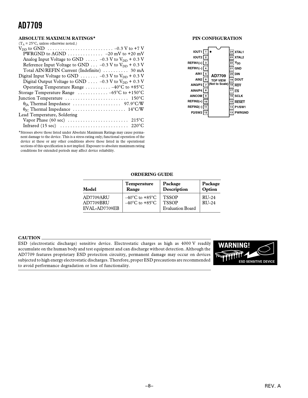 AD7709. ABSOLUTE MAXIMUM RATINGS*. PIN CONFIGURATION. IOUT1. 24 XTAL1. IOUT2. 23 XTAL2. REFIN1(+). 22 VDD. REFIN1(–). 21 GND. AIN1. 20 DIN. AIN2
