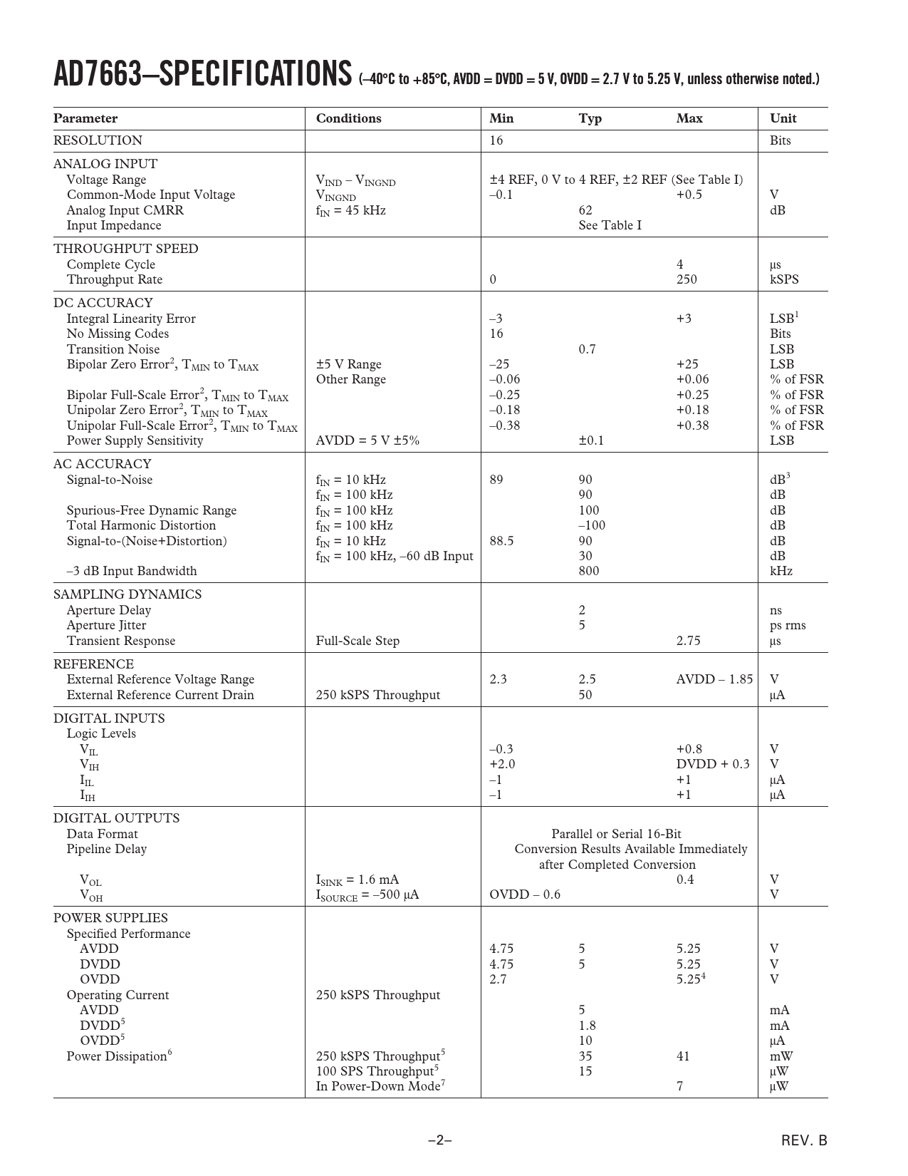 AD7663–SPECIFICATIONS (–40(–40 C to +85C to +85 C, AVDD = DVDD = 5 V, OVDD =C, AVDD = DVDD = 5 V, OVDD = 2.7 V to 5.25 V, unless otherwise noted.)ParameterConditionsMinTypMaxUnit RESOLUTION 16 Bits ANALOG INPUT Voltage Range VIND – VINGND ±4 REF, 0 V to 4 REF, ±2 REF (See Table I) Common-Mode Input Voltage VINGND –0.1 +0.5 V Analog Input CMRR fIN = 45 kHz 62 dB Input Impedance See Table I THROUGHPUT SPEED Complete Cycle 4 µs Throughput Rate 0 250 kSPS DC ACCURACY Integral Linearity Error –3 +3 LSB1 No Missing Codes 16 Bits Transition Noise 0.7 LSB Bipolar Zero Error2, TMIN to TMAX ±5 V Range –25 +25 LSB Other Range –0.06 +0.06 % of FSR Bipolar Full-Scale Error2, TMIN to TMAX –0.25 +0.25 % of FSR Unipolar Zero Error2, TMIN to TMAX –0.18 +0.18 % of FSR Unipolar Full-Scale Error2, TMIN to TMAX –0.38 +0.38 % of FSR Power Supply Sensitivity AVDD = 5 V ±5% ±0.1 LSB AC ACCURACY Signal-to-Noise fIN = 10 kHz 89 90 dB3 fIN = 100 kHz 90 dB Spurious-Free Dynamic Range fIN = 100 kHz 100 dB Total Harmonic Distortion fIN = 100 kHz –100 dB Signal-to-(Noise+Distortion) fIN = 10 kHz 88.5 90 dB fIN = 100 kHz, –60 dB Input 30 dB –3 dB Input Bandwidth 800 kHz SAMPLING DYNAMICS Aperture Delay 2 ns Aperture Jitter 5 ps rms Transient Response Full-Scale Step 2.75 µs REFERENCE External Reference Voltage Range 2.3 2.5 AVDD – 1.85 V External Reference Current Drain 250 kSPS Throughput 50 µA DIGITAL INPUTS Logic Levels VIL –0.3 +0.8 V VIH +2.0 DVDD + 0.3 V IIL –1 +1 µA IIH –1 +1 µA DIGITAL OUTPUTS Data Format Parallel or Serial 16-Bit Pipeline Delay Conversion Results Available Immediately after Completed Conversion VOL ISINK = 1.6 mA 0.4 V VOH ISOURCE = –500 µA OVDD – 0.6 V POWER SUPPLIES Specified Performance AVDD 4.75 5 5.25 V DVDD 4.75 5 5.25 V OVDD 2.7 5.254 V Operating Current 250 kSPS Throughput AVDD 5 mA DVDD5 1.8 mA OVDD5 10 µA Power Dissipation6 250 kSPS Throughput5 35 41 mW 100 SPS Throughput5 15 µW In Power-Down Mode7 7 µW –2– REV. B Document Outline FEATURES APPLICATIONS GENERAL DESCRIPTION PulSAR Selection FUNCTIONAL BLOCK DIAGRAM PRODUCT HIGHLIGHTS SPECIFICATIONS TIMING SPECIFICATIONS ABSOLUTE MAXIMUM RATINGS PIN CONFIGURATION ORDERING GUIDE PIN FUNCTION DESCRIPTION DEFINITION OF SPECIFICATIONS Integral Nonlinearity Error (INL) Differential Nonlinearity Error (DNL) Full-Scale Error Bipolar Zero Error Unipolar Zero Error Spurious-Free Dynamic Range (SFDR) Effective Number of Bits (ENOB) Total Harmonic Distortion (THD) Signal-to-Noise Ratio (SNR) Signal-to-(Noise + Distortion) Ratio (S/[N+D]) Aperture Delay Transient Response Typical Performance Characteristics CIRCUIT INFORMATION CONVERTER OPERATION Transfer Functions TYPICAL CONNECTION DIAGRAM Analog Inputs Driver Amplifier Choice Voltage Reference Input Scaler Reference Input (Bipolar Input Ranges) Power Supply POWER DISSIPATION CONVERSION CONTROL DIGITAL INTERFACE PARALLEL INTERFACE SERIAL INTERFACE MASTER SERIAL INTERFACE Internal Clock SLAVE SERIAL INTERFACE External Clock External Discontinuous Clock Data Read after Conversion External Clock Data Read during Conversion MICROPROCESSOR INTERFACING SPI Interface (MC68HC11) ADSP-21065L in Master Serial Interface APPLICATION HINTS Layout Evaluating the AD7663 Performance OUTLINE DIMENSIONS Revision History