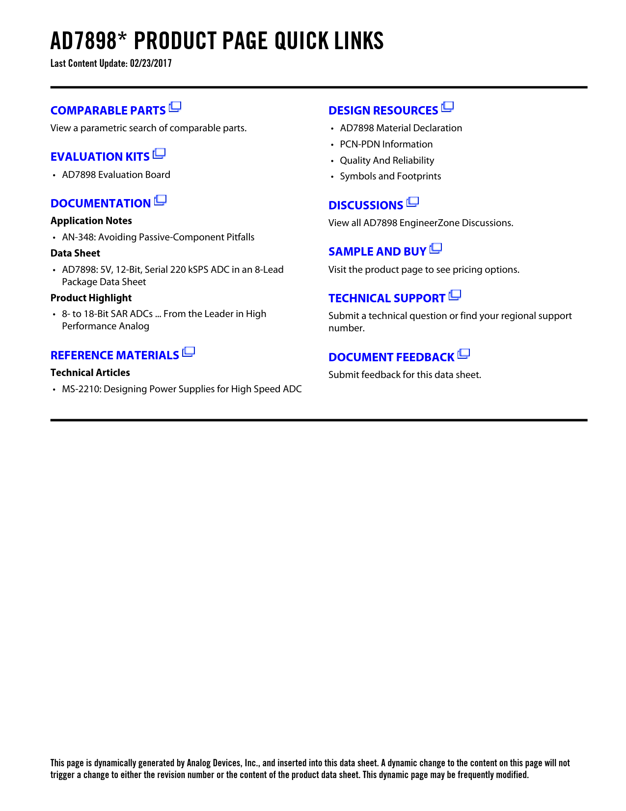 AD7898* PRODUCT PAGE QUICK LINKS Last Content Update: 02/23/2017. COMPARABLE PARTS. DESIGN RESOURCES. EVALUATION KITS