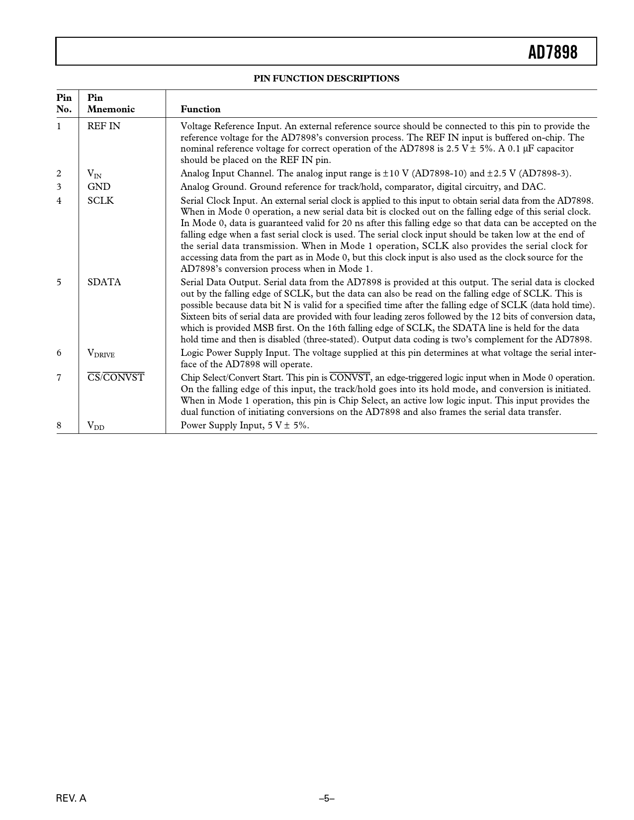 AD7898 PIN FUNCTION DESCRIPTIONS Pin Pin No. Mnemonic Function