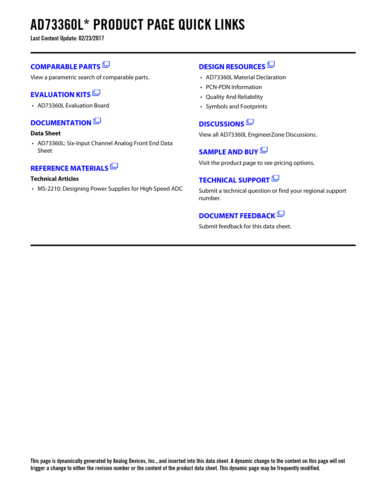 AD73360L* PRODUCT PAGE QUICK LINKS Last Content Update: 02/23/2017COMPARABLE PARTSDESIGN RESOURCES View a parametric search of comparable parts. • AD73360L Material Declaration • PCN-PDN Information EVALUATION KITS • Quality And Reliability • AD73360L Evaluation Board • Symbols and Footprints DOCUMENTATIONDISCUSSIONSData Sheet View all AD73360L EngineerZone Discussions. • AD73360L: Six-Input Channel Analog Front End Data Sheet SAMPLE AND BUY Visit the product page to see pricing options. REFERENCE MATERIALSTechnical ArticlesTECHNICAL SUPPORT • MS-2210: Designing Power Supplies for High Speed ADC Submit a technical question or find your regional support number. DOCUMENT FEEDBACK Submit feedback for this data sheet. This page is dynamically generated by Analog Devices, Inc., and inserted into this data sheet. A dynamic change to the content on this page will not trigger a change to either the revision number or the content of the product data sheet. This dynamic page may be frequently modified.
