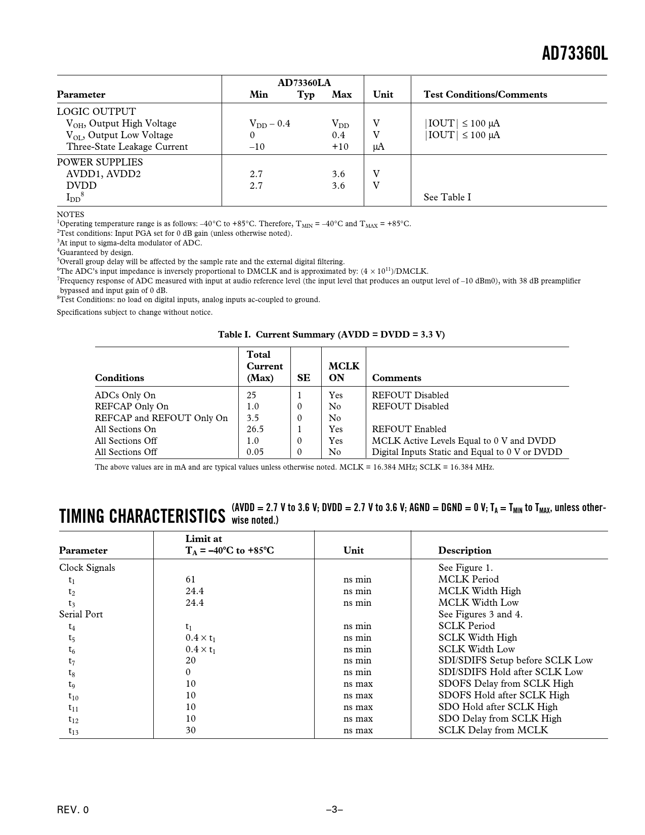 AD73360LAD73360LAParameterMinTypMaxUnitTest Conditions/Comments LOGIC OUTPUT VOH, Output High Voltage VDD – 0.4 VDD V |IOUT| ≤ 100 µA VOL, Output Low Voltage 0 0.4 V |IOUT| ≤ 100 µA Three-State Leakage Current –10 +10 µA POWER SUPPLIES AVDD1, AVDD2 2.7 3.6 V DVDD 2.7 3.6 V I 8 DD See Table I NOTES 1Operating temperature range is as follows: –40°C to +85°C. Therefore, TMIN = –40°C and TMAX = +85°C. 2Test conditions: Input PGA set for 0 dB gain (unless otherwise noted). 3At input to sigma-delta modulator of ADC. 4Guaranteed by design. 5Overall group delay will be affected by the sample rate and the external digital filtering. 6The ADC’s input impedance is inversely proportional to DMCLK and is approximated by: (4 × 1011)/DMCLK. 7Frequency response of ADC measured with input at audio reference level (the input level that produces an output level of –10 dBm0), with 38 dB preamplifier bypassed and input gain of 0 dB. 8Test Conditions: no load on digital inputs, analog inputs ac-coupled to ground. Specifications subject to change without notice. Table I. Current Summary (AVDD = DVDD = 3.3 V)Total CurrentMCLKConditions(Max)SEONComments ADCs Only On 25 1 Yes REFOUT Disabled REFCAP Only On 1.0 0 No REFOUT Disabled REFCAP and REFOUT Only On 3.5 0 No All Sections On 26.5 1 Yes REFOUT Enabled All Sections Off 1.0 0 Yes MCLK Active Levels Equal to 0 V and DVDD All Sections Off 0.05 0 No Digital Inputs Static and Equal to 0 V or DVDD The above values are in mA and are typical values unless otherwise noted. MCLK = 16.384 MHz; SCLK = 16.384 MHz. (AVDD = 2.7 V to 3.6 V; DVDD = 2.7 V to 3.6 V; AGND = DGND = 0 V; TTIMING CHARACTERISTICSA = TMlN to TMAX, unless other-wise noted.)Limit atParameterTA = –40 ⴗ C to +85 ⴗ CUnitDescription Clock Signals See Figure 1. t1 61 ns min MCLK Period t2 24.4 ns min MCLK Width High t3 24.4 ns min MCLK Width Low Serial Port See Figures 3 and 4. t4 t1 ns min SCLK Period t5 0.4 × t1 ns min SCLK Width High t6 0.4 × t1 ns min SCLK Width Low t7 20 ns min SDI/SDIFS Setup before SCLK Low t8 0 ns min SDI/SDIFS Hold after SCLK Low t9 10 ns max SDOFS Delay from SCLK High t10 10 ns max SDOFS Hold after SCLK High t11 10 ns max SDO Hold after SCLK High t12 10 ns max SDO Delay from SCLK High t13 30 ns max SCLK Delay from MCLK REV. 0 –3–