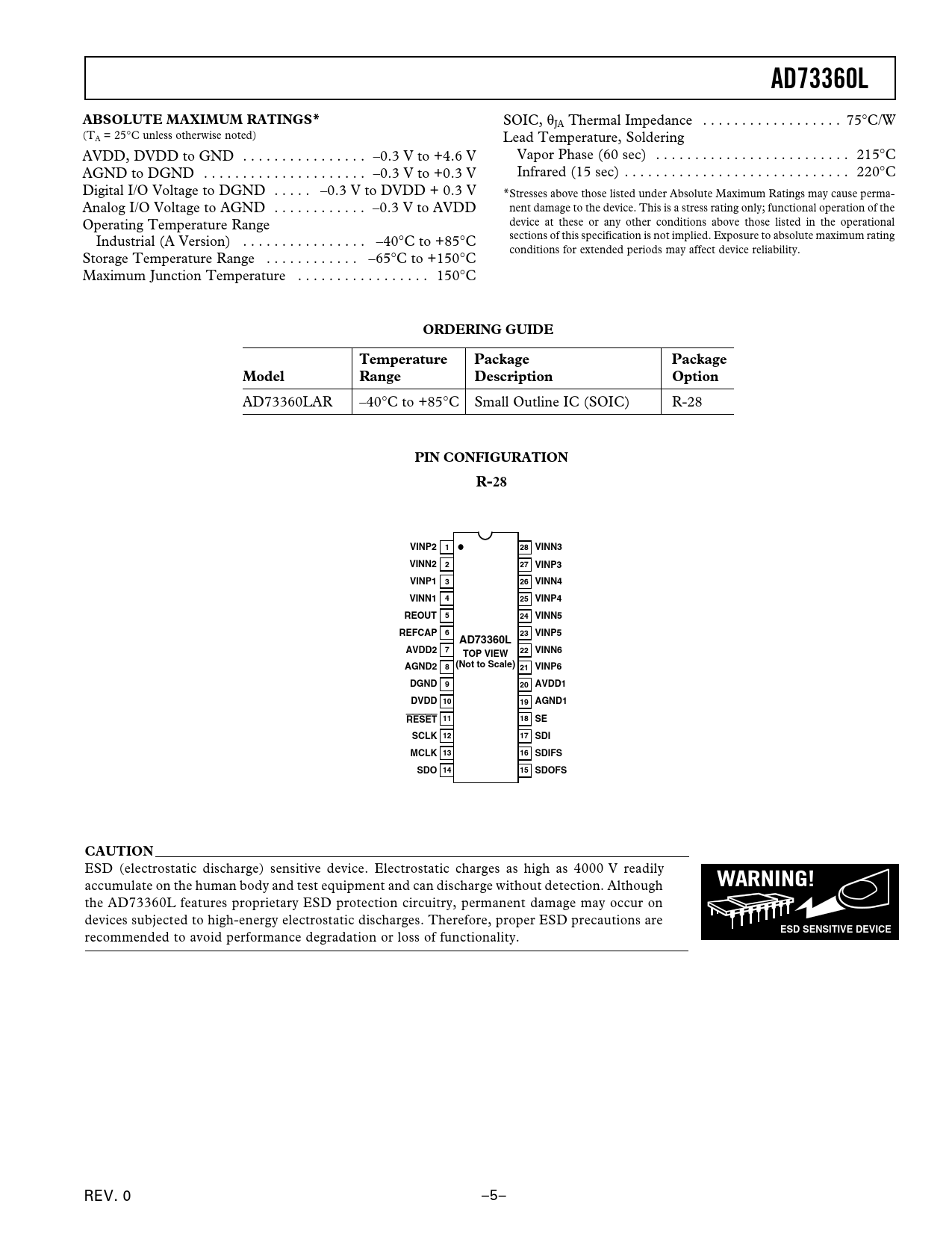 AD73360L ABSOLUTE MAXIMUM RATINGS* ORDERING GUIDE Temperature Package Model Range Description Option PIN CONFIGURATION R-28