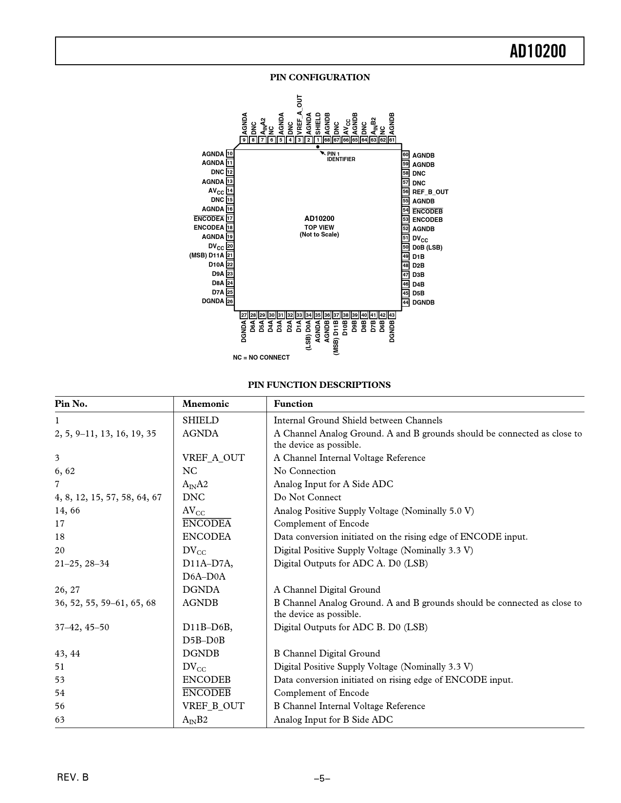1 SHIELD Internal Ground Shield between Channels 2, 5, 9–11, 13, 16, 19, 35 AGNDA A Channel Analog Ground. A and B grounds should be connected as close to the device as possible. 3 VREF_A_OUT A Channel Internal Voltage Reference 6, 62 NC No Connection 7 AINA2 Analog Input for A Side ADC 4, 8, 12, 15, 57, 58, 64, 67 DNC Do Not Connect 14, 66 AVCC Analog Positive Supply Voltage (Nominally 5.0 V) 17 ENCODEA Complement of Encode 18 ENCODEA Data conversion initiated on the rising edge of ENCODE input. 20 DVCC Digital Positive Supply Voltage (Nominally 3.3 V) 21–25, 28–34 D11A–D7A, Digital Outputs for ADC A. D0 (LSB) D6A–D0A 26, 27 DGNDA A Channel Digital Ground 36, 52, 55, 59–61, 65, 68 AGNDB B Channel Analog Ground. A and B grounds should be connected as close to the device as possible. 37–42, 45–50 D11B–D6B, Digital Outputs for ADC B. D0 (LSB) D5B–D0B 43, 44 DGNDB B Channel Digital Ground 51 DVCC Digital Positive Supply Voltage (Nominally 3.3 V) 53 ENCODEB Data conversion initiated on rising edge of ENCODE input. 54 ENCODEB Complement of Encode 56 VREF_B_OUT B Channel Internal Voltage Reference 63 AINB2 Analog Input for B Side ADC REV. B –5–
