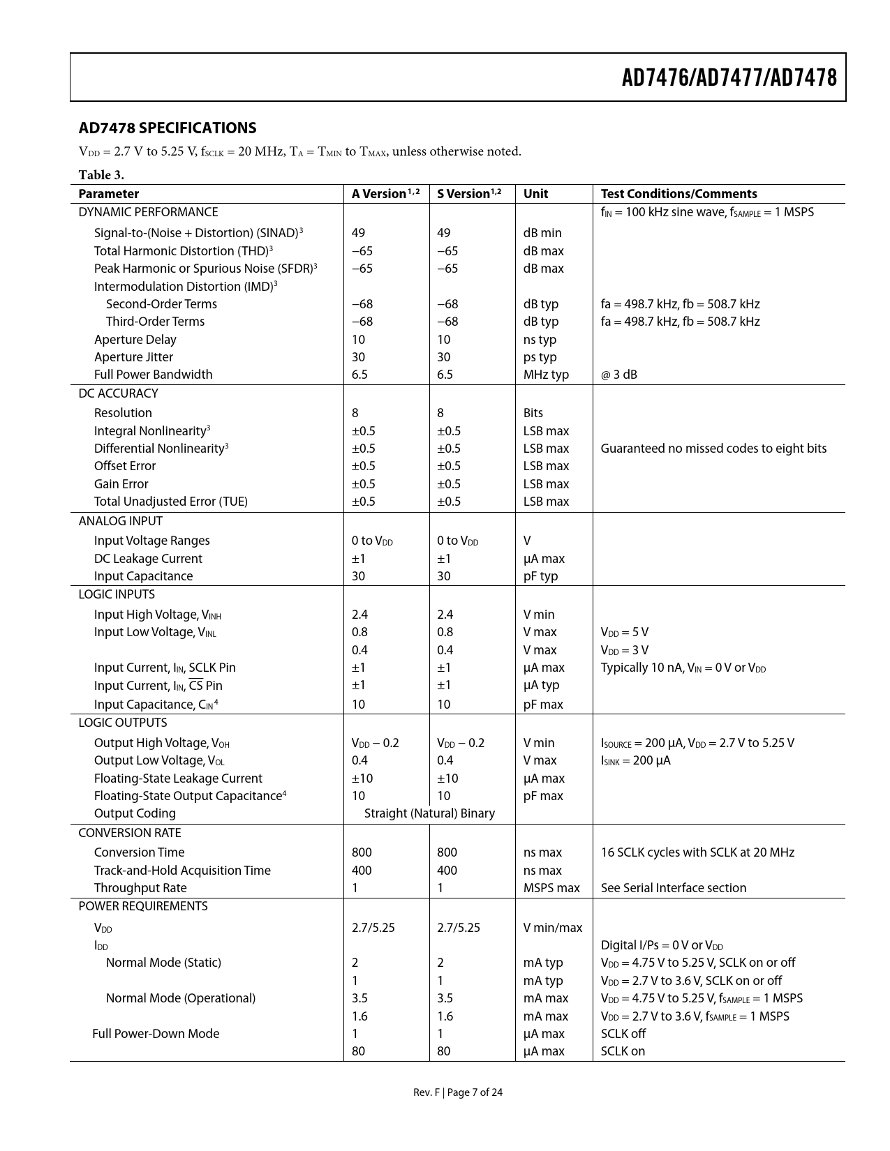 link to page 8 link to page 8 link to page 8 link to page 8 link to page 8 link to page 8 link to page 8 link to page 8 link to page 8 link to page 18 AD7476/AD7477/AD7478AD7478 SPECIFICATIONS VDD = 2.7 V to 5.25 V, fSCLK = 20 MHz, TA = TMIN to TMAX, unless otherwise noted. Table 3. ParameterA Version1,2 SVersion1,2UnitTest Conditions/Comments DYNAMIC PERFORMANCE fIN = 100 kHz sine wave, fSAMPLE = 1 MSPS Signal-to-(Noise + Distortion) (SINAD)3 49 49 dB min Total Harmonic Distortion (THD)3 −65 −65 dB max Peak Harmonic or Spurious Noise (SFDR)3 −65 −65 dB max Intermodulation Distortion (IMD)3 Second-Order Terms −68 −68 dB typ fa = 498.7 kHz, fb = 508.7 kHz Third-Order Terms −68 −68 dB typ fa = 498.7 kHz, fb = 508.7 kHz Aperture Delay 10 10 ns typ Aperture Jitter 30 30 ps typ Full Power Bandwidth 6.5 6.5 MHz typ @ 3 dB DC ACCURACY Resolution 8 8 Bits Integral Nonlinearity3 ±0.5 ±0.5 LSB max Differential Nonlinearity3 ±0.5 ±0.5 LSB max Guaranteed no missed codes to eight bits Offset Error ±0.5 ±0.5 LSB max Gain Error ±0.5 ±0.5 LSB max Total Unadjusted Error (TUE) ±0.5 ±0.5 LSB max ANALOG INPUT Input Voltage Ranges 0 to VDD 0 to VDD V DC Leakage Current ±1 ±1 μA max Input Capacitance 30 30 pF typ LOGIC INPUTS Input High Voltage, VINH 2.4 2.4 V min Input Low Voltage, VINL 0.8 0.8 V max VDD = 5 V 0.4 0.4 V max VDD = 3 V Input Current, IIN, SCLK Pin ±1 ±1 μA max Typically 10 nA, VIN = 0 V or VDD Input Current, IIN, CS Pin ±1 ±1 μA typ Input Capacitance, C 4 IN 10 10 pF max LOGIC OUTPUTS Output High Voltage, VOH VDD − 0.2 VDD − 0.2 V min ISOURCE = 200 μA, VDD = 2.7 V to 5.25 V Output Low Voltage, VOL 0.4 0.4 V max ISINK = 200 μA Floating-State Leakage Current ±10 ±10 μA max Floating-State Output Capacitance4 10 10 pF max Output Coding Straight (Natural) Binary CONVERSION RATE Conversion Time 800 800 ns max 16 SCLK cycles with SCLK at 20 MHz Track-and-Hold Acquisition Time 400 400 ns max Throughput Rate 1 1 MSPS max See Serial Interface section POWER REQUIREMENTS VDD 2.7/5.25 2.7/5.25 V min/max IDD Digital I/Ps = 0 V or VDD Normal Mode (Static) 2 2 mA typ VDD = 4.75 V to 5.25 V, SCLK on or off 1 1 mA typ VDD = 2.7 V to 3.6 V, SCLK on or off Normal Mode (Operational) 3.5 3.5 mA max VDD = 4.75 V to 5.25 V, fSAMPLE = 1 MSPS 1.6 1.6 mA max VDD = 2.7 V to 3.6 V, fSAMPLE = 1 MSPS Full Power-Down Mode 1 1 μA max SCLK off 80 80 μA max SCLK on Rev. F | Page 7 of 24 Document Outline FEATURES APPLICATIONS GENERAL DESCRIPTION FUNCTIONAL BLOCK DIAGRAM PRODUCT HIGHLIGHTS TABLE OF CONTENTS REVISION HISTORY SPECIFICATIONS AD7476 SPECIFICATIONS AD7477 SPECIFICATIONS AD7478 SPECIFICATIONS TIMING SPECIFICATIONS ABSOLUTE MAXIMUM RATINGS ESD CAUTION PIN CONFIGURATION AND FUNCTION DESCRIPTIONS TYPICAL PERFORMANCE CHARACTERISTICS TERMINOLOGY THEORY OF OPERATION CIRCUIT INFORMATION CONVERTER OPERATION ADC TRANSFER FUNCTION TYPICAL CONNECTION DIAGRAM Analog Input Digital Input MODES OF OPERATION Normal Mode Power-Down Mode Power-Up Time POWER VS. THROUGHPUT RATE SERIAL INTERFACE MICROPROCESSOR INTERFACING AD7476/AD7477/AD7478 to TMS320C5x/C54x Interface AD7476/AD7477/AD7478 to ADSP-21xx Interface AD7476/AD7477/AD7478 to DSP56xxx Interface AD7476/AD7477/AD7478 to MC68HC16 Interface OUTLINE DIMENSIONS ORDERING GUIDE