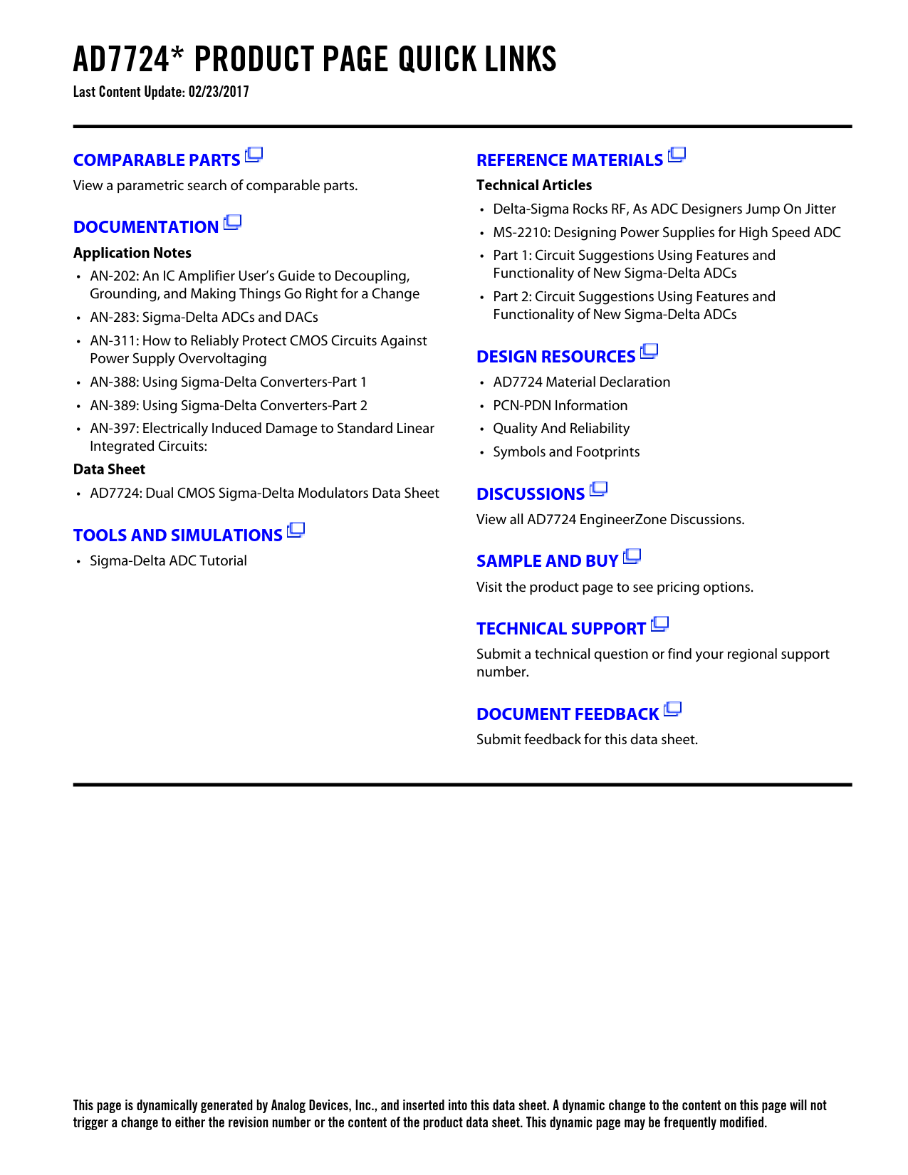 AD7724* PRODUCT PAGE QUICK LINKS Last Content Update: 02/23/2017COMPARABLE PARTSREFERENCE MATERIALS View a parametric search of comparable parts. Technical Articles • Delta-Sigma Rocks RF, As ADC Designers Jump On Jitter DOCUMENTATION • MS-2210: Designing Power Supplies for High Speed ADC Application Notes • Part 1: Circuit Suggestions Using Features and • AN-202: An IC Amplifier User’s Guide to Decoupling, Functionality of New Sigma-Delta ADCs Grounding, and Making Things Go Right for a Change • Part 2: Circuit Suggestions Using Features and • AN-283: Sigma-Delta ADCs and DACs Functionality of New Sigma-Delta ADCs • AN-311: How to Reliably Protect CMOS Circuits Against Power Supply Overvoltaging DESIGN RESOURCES • AN-388: Using Sigma-Delta Converters-Part 1 • AD7724 Material Declaration • AN-389: Using Sigma-Delta Converters-Part 2 • PCN-PDN Information • AN-397: Electrically Induced Damage to Standard Linear • Quality And Reliability Integrated Circuits: • Symbols and Footprints Data Sheet • AD7724: Dual CMOS Sigma-Delta Modulators Data Sheet DISCUSSIONS View all AD7724 EngineerZone Discussions. TOOLS AND SIMULATIONS • Sigma-Delta ADC Tutorial SAMPLE AND BUY Visit the product page to see pricing options. TECHNICAL SUPPORT Submit a technical question or find your regional support number. DOCUMENT FEEDBACK Submit feedback for this data sheet. This page is dynamically generated by Analog Devices, Inc., and inserted into this data sheet. A dynamic change to the content on this page will not trigger a change to either the revision number or the content of the product data sheet. This dynamic page may be frequently modified.