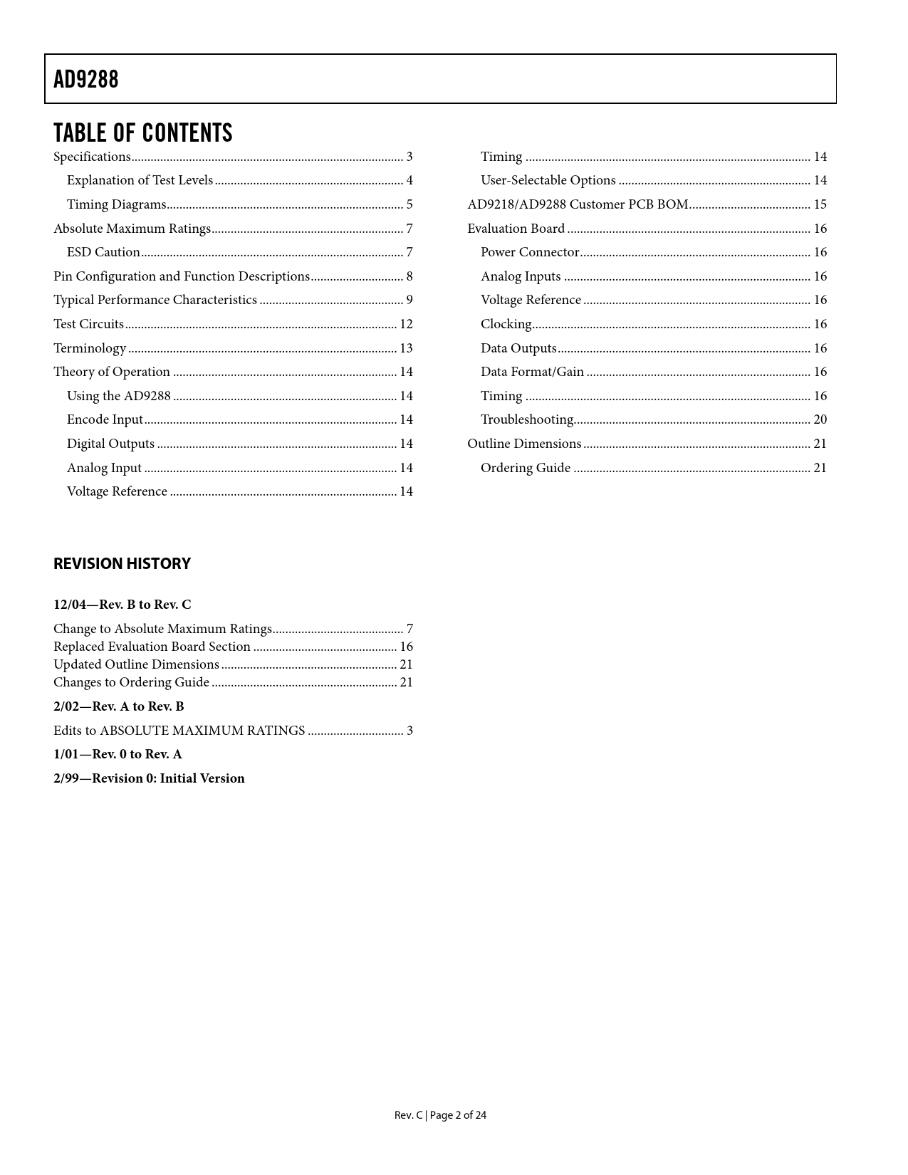 页数 / 页25 / 3 — AD9288. TABLE OF CONTENTS. REVISION HISTORY. 12/04—Rev. B to Rev. C. …