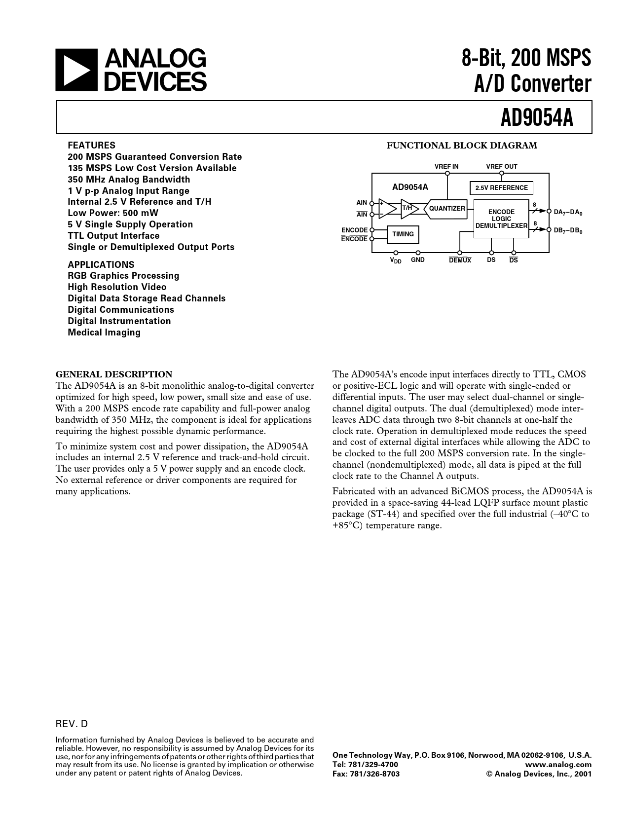 | 页数 / 页 | 21 / 1 — 8-Bit, 200 MSPS. A/D Converter. AD9054A. FEATURES. FUNCTIONAL BLOCK … |