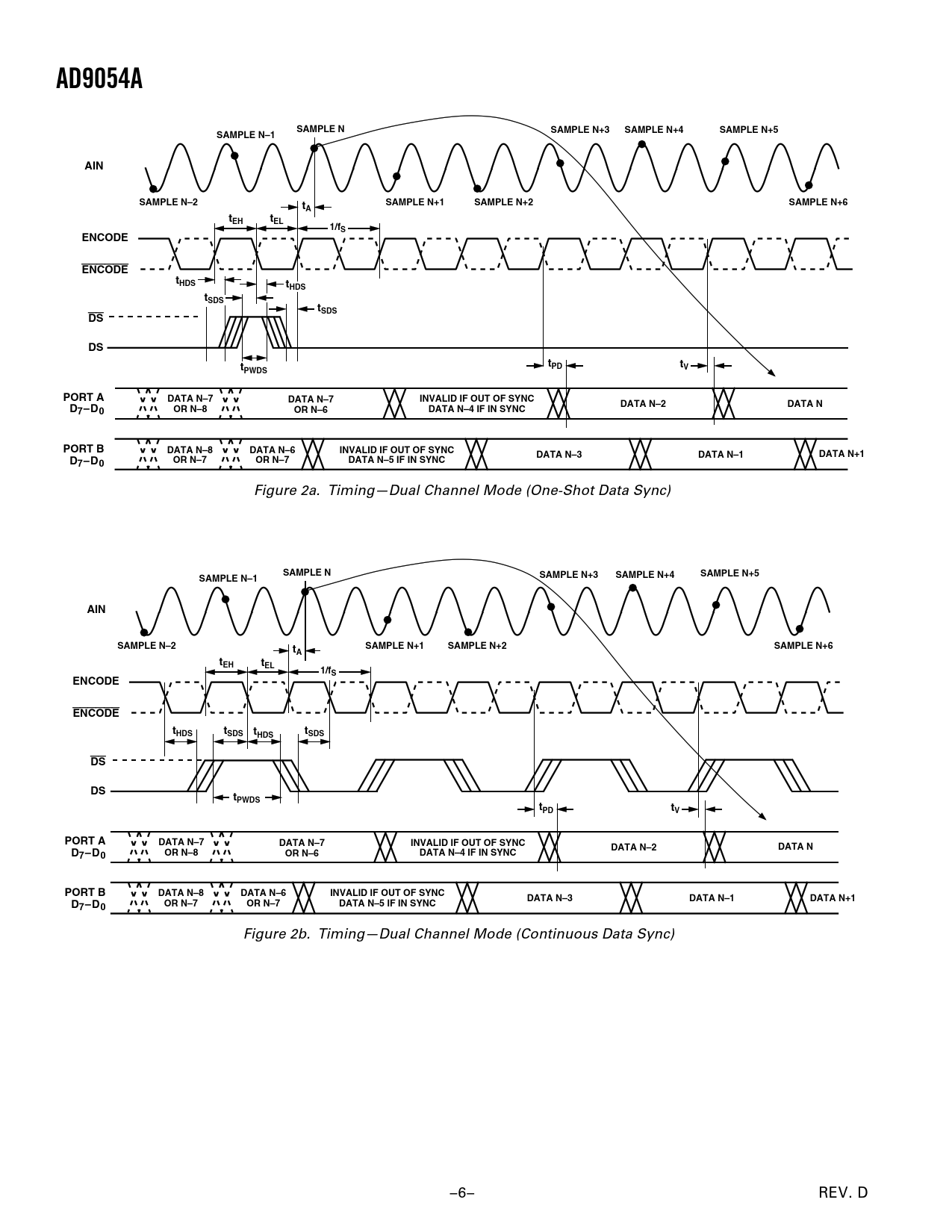 AD9054A SAMPLE N SAMPLE N+3 SAMPLE N+4 SAMPLE N+5 SAMPLE N–1 AIN SAMPLE N–2 SAMPLE N+1 SAMPLE N+2 SAMPLE N+6 tA tEH tEL 1/fS ENCODE ENCODE tHDS tHDS tSDS tSDS DS DS tPD t t V PWDS PORT A DATA N–7 DATA N–7 INVALID IF OUT OF SYNC D DATA N–2 DATA N 7–D0 OR N–8 OR N–6 DATA N–4 IF IN SYNC PORT B DATA N–8 DATA N–6 INVALID IF OUT OF SYNC DATA N–3 DATA N–1 DATA N+1 D7–D0 OR N–7 OR N–7 DATA N–5 IF IN SYNC