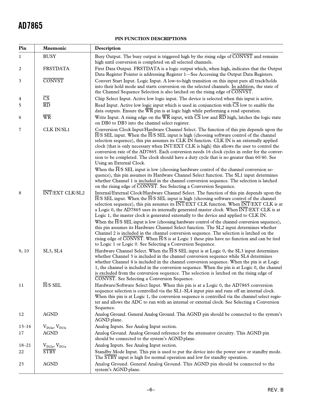 AD7865PIN FUNCTION DESCRIPTIONSPinMnemonicDescription 1 BUSY Busy Output. The busy output is triggered high by the rising edge of CONVST and remains high until conversion is completed on all selected channels. 2 FRSTDATA First Data Output. FRSTDATA is a logic output which, when high, indicates that the Output Data Register Pointer is addressing Register 1—See Accessing the Output Data Registers. 3 CONVST Convert Start Input. Logic Input. A low-to-high transition on this input puts all track/holds into their hold mode and starts conversion on the selected channels. In addition, the state of the Channel Sequence Selection is also latched on the rising edge of CONVST. 4 CS Chip Select Input. Active low logic input. The device is selected when this input is active. 5 RD Read Input. Active low logic input which is used in conjunction with CS low to enable the data outputs. Ensure the WR pin is at logic high while performing a read operation. 6 WR Write Input. A rising edge on the WR input, with CS low and RD high, latches the logic state on DB0 to DB3 into the channel select register. 7 CLK IN/SL1 Conversion Clock Input/Hardware Channel Select. The function of this pin depends upon the H/S SEL input. When the H/S SEL input is high (choosing software control of the channel selection sequence), this pin assumes its CLK IN function. CLK IN is an externally applied clock (that is only necessary when INT/EXT CLK is high) this allows the user to control the conversion rate of the AD7865. Each conversion needs 16 clock cycles in order for the conver- sion to be completed. The clock should have a duty cycle that is no greater than 60/40. See Using an External Clock. When the H/S SEL input is low (choosing hardware control of the channel conversion se- quence), this pin assumes its Hardware Channel Select function. The SL1 input determines whether Channel 1 is included in the channel conversion sequence. The selection is latched on the rising edge of CONVST. See Selecting a Conversion Sequence. 8 INT/EXT CLK/SL2 Internal/External Clock/Hardware Channel Select. The function of this pin depends upon the H/S SEL input. When the H/S SEL input is high (choosing software control of the channel selection sequence), this pin assumes its INT/EXT CLK function. When INT/EXT CLK is at a Logic 0, the AD7865 uses its internally generated master clock. When INT/EXT CLK is at Logic 1, the master clock is generated externally to the device and applied to CLK IN. When the H/S SEL input is low (choosing hardware control of the channel conversion sequence), this pin assumes its Hardware Channel Select function. The SL2 input determines whether Channel 2 is included in the channel conversion sequence. The selection is latched on the rising edge of CONVST. When H/S is at Logic 1 these pins have no function and can be tied to Logic 1 or Logic 0. See Selecting a Conversion Sequence. 9, 10 SL3, SL4 Hardware Channel Select. When the H/S SEL input is at Logic 0, the SL3 input determines whether Channel 3 is included in the channel conversion sequence while SL4 determines whether Channel 4 is included in the channel conversion sequence. When the pin is at Logic 1, the channel is included in the conversion sequence. When the pin is at Logic 0, the channel is excluded from the conversion sequence. The selection is latched on the rising edge of CONVST. See Selecting a Conversion Sequence. 11 H/S SEL Hardware/Software Select Input. When this pin is at a Logic 0, the AD7865 conversion sequence selection is controlled via the SL1–SL4 input pins and runs off an internal clock. When this pin is at Logic 1, the conversion sequence is controlled via the channel select regis- ter and allows the ADC to run with an internal or external clock. See Selecting a Conversion Sequence. 12 AGND Analog Ground. General Analog Ground. This AGND pin should be connected to the system’s AGND plane. 13–16 VIN4x, VIN3x Analog Inputs. See Analog Input section. 17 AGND Analog Ground. Analog Ground reference for the attenuator circuitry. This AGND pin should be connected to the system’s AGND plane. 18–21 VIN2x, VIN1x Analog Inputs. See Analog Input section. 22 STBY Standby Mode Input. This pin is used to put the device into the power save or standby mode. The STBY input is high for normal operation and low for standby operation. 23 AGND Analog Ground. General Analog Ground. This AGND pin should be connected to the system’s AGND plane. –6– REV. B