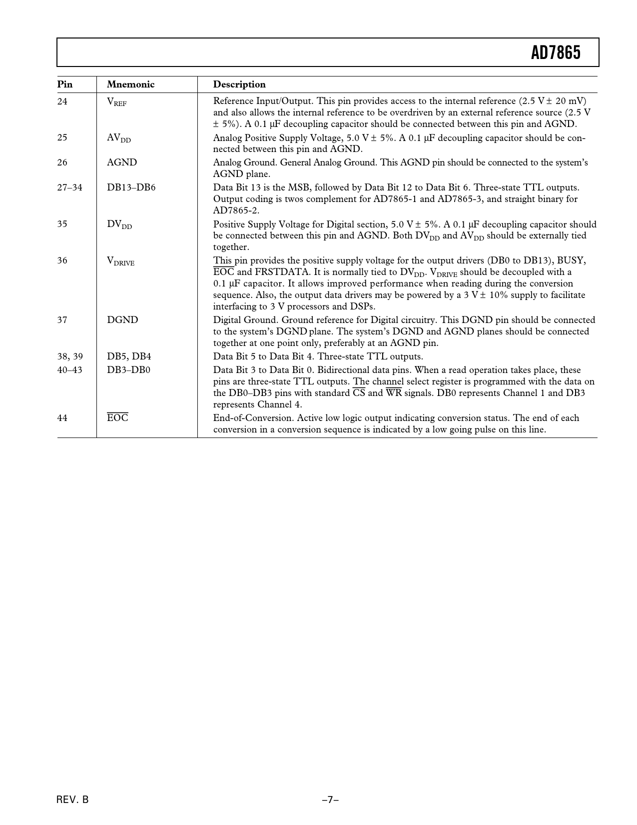 AD7865PinMnemonicDescription 24 VREF Reference Input/Output. This pin provides access to the internal reference (2.5 V ± 20 mV) and also allows the internal reference to be overdriven by an external reference source (2.5 V ± 5%). A 0.1 µF decoupling capacitor should be connected between this pin and AGND. 25 AVDD Analog Positive Supply Voltage, 5.0 V ± 5%. A 0.1 µF decoupling capacitor should be con- nected between this pin and AGND. 26 AGND Analog Ground. General Analog Ground. This AGND pin should be connected to the system’s AGND plane. 27–34 DB13–DB6 Data Bit 13 is the MSB, followed by Data Bit 12 to Data Bit 6. Three-state TTL outputs. Output coding is twos complement for AD7865-1 and AD7865-3, and straight binary for AD7865-2. 35 DVDD Positive Supply Voltage for Digital section, 5.0 V ± 5%. A 0.1 µF decoupling capacitor should be connected between this pin and AGND. Both DVDD and AVDD should be externally tied together. 36 VDRIVE This pin provides the positive supply voltage for the output drivers (DB0 to DB13), BUSY, EOC and FRSTDATA. It is normally tied to DVDD. VDRIVE should be decoupled with a 0.1 µF capacitor. It allows improved performance when reading during the conversion sequence. Also, the output data drivers may be powered by a 3 V ± 10% supply to facilitate interfacing to 3 V processors and DSPs. 37 DGND Digital Ground. Ground reference for Digital circuitry. This DGND pin should be connected to the system’s DGND plane. The system’s DGND and AGND planes should be connected together at one point only, preferably at an AGND pin. 38, 39 DB5, DB4 Data Bit 5 to Data Bit 4. Three-state TTL outputs. 40–43 DB3–DB0 Data Bit 3 to Data Bit 0. Bidirectional data pins. When a read operation takes place, these pins are three-state TTL outputs. The channel select register is programmed with the data on the DB0–DB3 pins with standard CS and WR signals. DB0 represents Channel 1 and DB3 represents Channel 4. 44 EOC End-of-Conversion. Active low logic output indicating conversion status. The end of each conversion in a conversion sequence is indicated by a low going pulse on this line. REV. B –7–