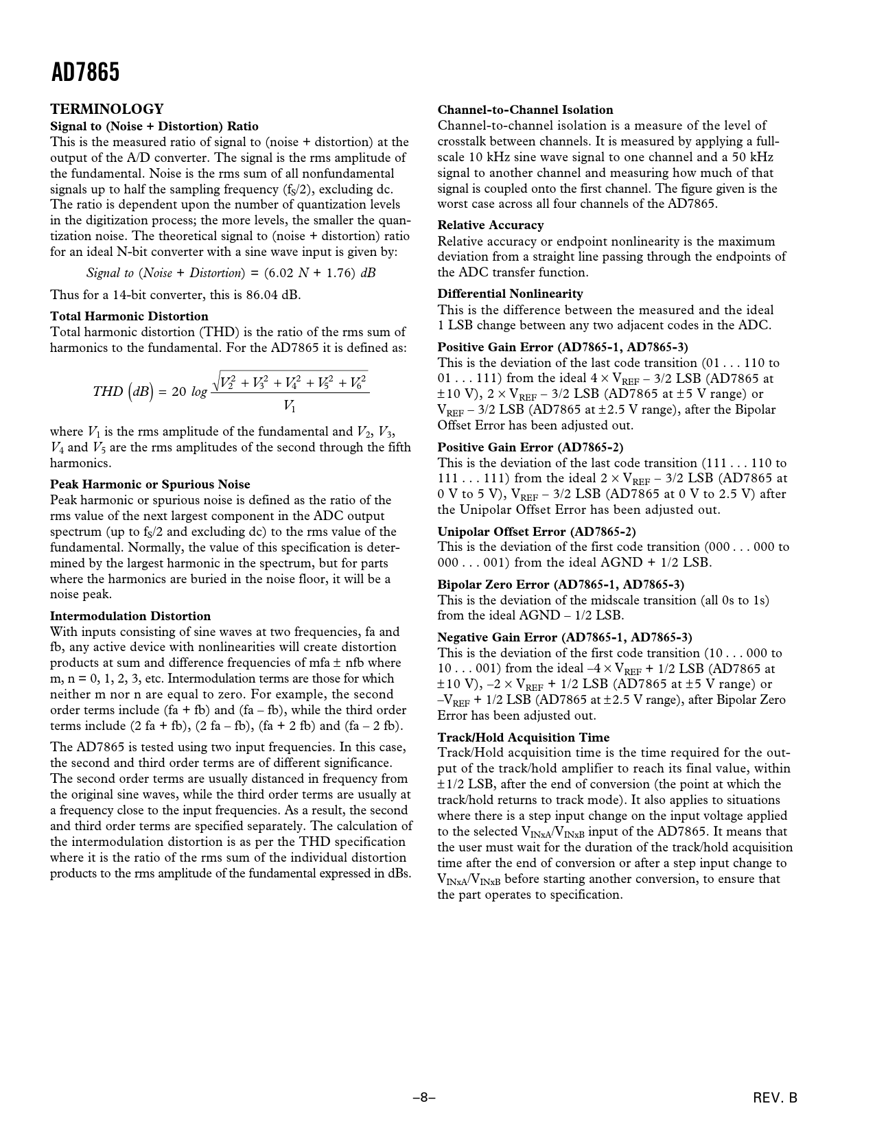 AD7865TERMINOLOGYChannel-to-Channel IsolationSignal to (Noise + Distortion) Ratio Channel-to-channel isolation is a measure of the level of This is the measured ratio of signal to (noise + distortion) at the crosstalk between channels. It is measured by applying a full- output of the A/D converter. The signal is the rms amplitude of scale 10 kHz sine wave signal to one channel and a 50 kHz the fundamental. Noise is the rms sum of all nonfundamental signal to another channel and measuring how much of that signals up to half the sampling frequency (fS/2), excluding dc. signal is coupled onto the first channel. The figure given is the The ratio is dependent upon the number of quantization levels worst case across all four channels of the AD7865. in the digitization process; the more levels, the smaller the quan- Relative Accuracy tization noise. The theoretical signal to (noise + distortion) ratio Relative accuracy or endpoint nonlinearity is the maximum for an ideal N-bit converter with a sine wave input is given by: deviation from a straight line passing through the endpoints of Signal to (Noise + Distortion) = (6.02 N + 1.76) dB the ADC transfer function. Thus for a 14-bit converter, this is 86.04 dB. Differential Nonlinearity This is the difference between the measured and the ideal Total Harmonic Distortion 1 LSB change between any two adjacent codes in the ADC. Total harmonic distortion (THD) is the ratio of the rms sum of harmonics to the fundamental. For the AD7865 it is defined as: Positive Gain Error (AD7865-1, AD7865-3) This is the deviation of the last code transition (01 . 110 to 2 V + V 2 2 2 2 01 . 111) from the ideal 4 × VREF – 3/2 LSB (AD7865 at 3 + V4 + V5 + V THD dB ( ) = 20 2 6 log ± 10 V), 2 × VREF – 3/2 LSB (AD7865 at ± 5 V range) or V1 VREF – 3/2 LSB (AD7865 at ± 2.5 V range), after the Bipolar where V Offset Error has been adjusted out. 1 is the rms amplitude of the fundamental and V2, V3, V4 and V5 are the rms amplitudes of the second through the fifth Positive Gain Error (AD7865-2) harmonics. This is the deviation of the last code transition (111 . 110 to 111 . 111) from the ideal 2 × V Peak Harmonic or Spurious Noise REF – 3/2 LSB (AD7865 at Peak harmonic or spurious noise is defined as the ratio of the 0 V to 5 V), VREF – 3/2 LSB (AD7865 at 0 V to 2.5 V) after rms value of the next largest component in the ADC output the Unipolar Offset Error has been adjusted out. spectrum (up to fS/2 and excluding dc) to the rms value of the Unipolar Offset Error (AD7865-2) fundamental. Normally, the value of this specification is deter- This is the deviation of the first code transition (000 . 000 to mined by the largest harmonic in the spectrum, but for parts 000 . 001) from the ideal AGND + 1/2 LSB. where the harmonics are buried in the noise floor, it will be a Bipolar Zero Error (AD7865-1, AD7865-3) noise peak. This is the deviation of the midscale transition (all 0s to 1s) Intermodulation Distortion from the ideal AGND – 1/2 LSB. With inputs consisting of sine waves at two frequencies, fa and Negative Gain Error (AD7865-1, AD7865-3) fb, any active device with nonlinearities will create distortion This is the deviation of the first code transition (10 . 000 to products at sum and difference frequencies of mfa ± nfb where 10 . 001) from the ideal –4 × VREF + 1/2 LSB (AD7865 at m, n = 0, 1, 2, 3, etc. Intermodulation terms are those for which ± 10 V), –2 × VREF + 1/2 LSB (AD7865 at ± 5 V range) or neither m nor n are equal to zero. For example, the second –VREF + 1/2 LSB (AD7865 at ± 2.5 V range), after Bipolar Zero order terms include (fa + fb) and (fa – fb), while the third order Error has been adjusted out. terms include (2 fa + fb), (2 fa – fb), (fa + 2 fb) and (fa – 2 fb). Track/Hold Acquisition Time The AD7865 is tested using two input frequencies. In this case, Track/Hold acquisition time is the time required for the out- the second and third order terms are of different significance. put of the track/hold amplifier to reach its final value, within The second order terms are usually distanced in frequency from ± 1/2 LSB, after the end of conversion (the point at which the the original sine waves, while the third order terms are usually at track/hold returns to track mode). It also applies to situations a frequency close to the input frequencies. As a result, the second where there is a step input change on the input voltage applied and third order terms are specified separately. The calculation of to the selected VINxA/VINxB input of the AD7865. It means that the intermodulation distortion is as per the THD specification the user must wait for the duration of the track/hold acquisition where it is the ratio of the rms sum of the individual distortion time after the end of conversion or after a step input change to products to the rms amplitude of the fundamental expressed in dBs. VINxA/VINxB before starting another conversion, to ensure that the part operates to specification. –8– REV. B