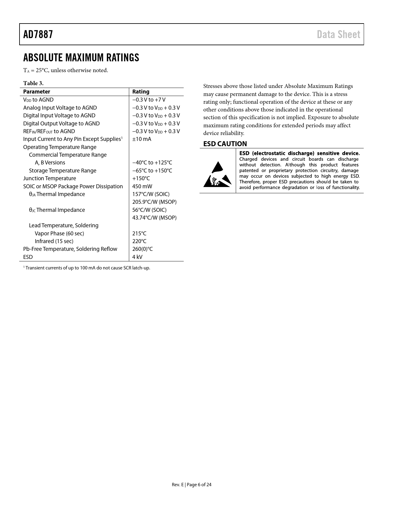 AD7887. Data Sheet. ABSOLUTE MAXIMUM RATINGS. Table 3. Parameter. Rating. ESD CAUTION