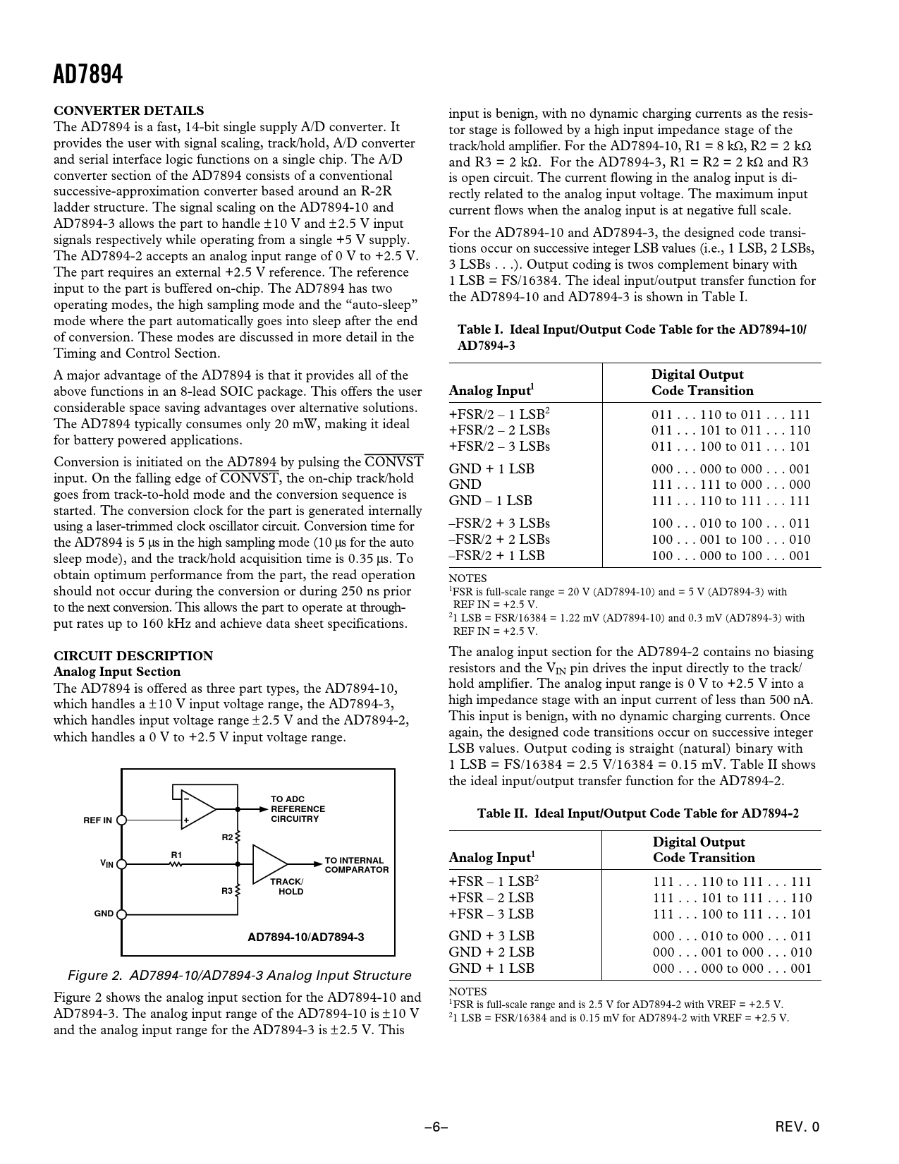 resistors and the VIN pin drives the input directly to the track/ The AD7894 is offered as three part types, the AD7894-10, hold amplifier. The analog input range is 0 V to +2.5 V into a which handles a ± 10 V input voltage range, the AD7894-3, high impedance stage with an input current of less than 500␣ nA. which handles input voltage range ± 2.5 V and the AD7894-2, This input is benign, with no dynamic charging currents. Once which handles a 0␣ V to +2.5␣ V input voltage range. again, the designed code transitions occur on successive integer LSB values. Output coding is straight (natural) binary with 1 LSB = FS/16384 = 2.5 V/16384 = 0.15 mV. Table II shows the ideal input/output transfer function for the AD7894-2.