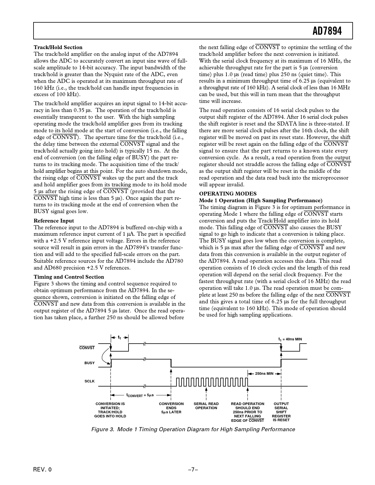 AD7894Track/Hold Section the next falling edge of CONVST to optimize the settling of the The track/hold amplifier on the analog input of the AD7894 track/hold amplifier before the next conversion is initiated. allows the ADC to accurately convert an input sine wave of full- With the serial clock frequency at its maximum of 16␣ MHz, the scale amplitude to 14-bit accuracy. The input bandwidth of the achievable throughput rate for the part is 5␣ µs (conversion track/hold is greater than the Nyquist rate of the ADC, even time) plus 1.0␣ µs (read time) plus 250␣ ns (quiet time). This when the ADC is operated at its maximum throughput rate of results in a minimum throughput time of 6.25␣ µs (equivalent to 160 kHz (i.e., the track/hold can handle input frequencies in a throughput rate of 160 kHz). A serial clock of less than 16 MHz excess of 100 kHz). can be used, but this will in turn mean that the throughput The track/hold amplifier acquires an input signal to 14-bit accu- time will increase. racy in less than 0.35␣ µs. The operation of the track/hold is The read operation consists of 16 serial clock pulses to the essentially transparent to the user. With the high sampling output shift register of the AD7894. After 16 serial clock pulses operating mode the track/hold amplifier goes from its tracking the shift register is reset and the SDATA line is three-stated. If mode to its hold mode at the start of conversion (i.e., the falling there are more serial clock pulses after the 16th clock, the shift edge of CONVST). The aperture time for the track/hold (i.e., register will be moved on past its reset state. However, the shift the delay time between the external CONVST signal and the register will be reset again on the falling edge of the CONVST track/hold actually going into hold) is typically 15␣ ns. At the signal to ensure that the part returns to a known state every end of conversion (on the falling edge of BUSY) the part re- conversion cycle. As a result, a read operation from the output turns to its tracking mode. The acquisition time of the track/ register should not straddle across the falling edge of CONVST hold amplifier begins at this point. For the auto shutdown mode, as the output shift register will be reset in the middle of the the rising edge of CONVST wakes up the part and the track read operation and the data read back into the microprocessor and hold amplifier goes from its tracking mode to its hold mode will appear invalid. 5 µs after the rising edge of CONVST (provided that the OPERATING MODES CONVST high time is less than 5 µs). Once again the part re- Mode 1 Operation (High Sampling Performance) turns to its tracking mode at the end of conversion when the The timing diagram in Figure 3 is for optimum performance in BUSY signal goes low. operating Mode 1 where the falling edge of CONVST starts Reference Input conversion and puts the Track/Hold amplifier into its hold The reference input to the AD7894 is buffered on-chip with a mode. This falling edge of CONVST also causes the BUSY maximum reference input current of 1␣ µA. The part is specified signal to go high to indicate that a conversion is taking place. with a +2.5 V reference input voltage. Errors in the reference The BUSY signal goes low when the conversion is complete, source will result in gain errors in the AD7894’s transfer func- which is 5 µs max after the falling edge of CONVST and new tion and will add to the specified full-scale errors on the part. data from this conversion is available in the output register of Suitable reference sources for the AD7894 include the AD780 the AD7894. A read operation accesses this data. This read and AD680 precision +2.5 V references. operation consists of 16 clock cycles and the length of this read operation will depend on the serial clock frequency. For the Timing and Control Section Figure 3 shows the timing and control sequence required to fastest throughput rate (with a serial clock of 16 MHz) the read obtain optimum performance from the AD7894. In the se- operation will take 1.0 µs. The read operation must be com- quence shown, conversion is initiated on the falling edge of plete at least 250 ns before the falling edge of the next CONVST CONVST and new data from this conversion is available in the and this gives a total time of 6.25 µs for the full throughput output register of the AD7894 5␣ µs later. Once the read opera- time (equivalent to 160 kHz). This mode of operation should tion has taken place, a further 250␣ ns should be allowed before be used for high sampling applications. t1 = 40ns MINCONVSTBUSY250ns MINSCLKtCONVERT = 5 m sCONVERSION ISCONVERSIONSERIAL READREAD OPERATIONOUTPUTINITIATED;ENDSOPERATIONSHOULD ENDSERIALTRACK/HOLD5 m s LATER250ns PRIOR TOSHIFTGOES INTO HOLDNEXT FALLINGREGISTEREDGE OF CONVSTIS RESET Figure 3. Mode 1 Timing Operation Diagram for High Sampling Performance REV. 0 –7–