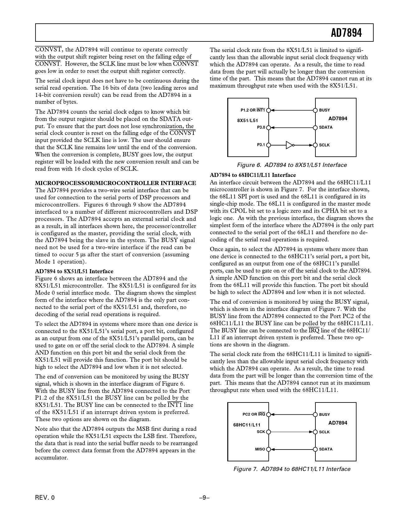 AD7894 CONVST, the AD7894 will continue to operate correctly The serial clock rate from the 8X51/L51 is limited to signifi- with the output shift register being reset on the falling edge of cantly less than the allowable input serial clock frequency with CONVST. However, the SCLK line must be low when CONVST which the AD7894 can operate. As a result, the time to read goes low in order to reset the output shift register correctly. data from the part will actually be longer than the conversion The serial clock input does not have to be continuous during the time of the part. This means that the AD7894 cannot run at its serial read operation. The 16 bits of data (two leading zeros and maximum throughput rate when used with the 8X51/L51. 14-bit conversion result) can be read from the AD7894 in a number of bytes. The AD7894 counts the serial clock edges to know which bit P1.2 OR INT1BUSY from the output register should be placed on the SDATA out- AD78948X51/L51 put. To ensure that the part does not lose synchronization, the P3.0SDATA serial clock counter is reset on the falling edge of the CONVST input provided the SCLK line is low. The user should ensure that the SCLK line remains low until the end of the conversion. P3.1SCLK When the conversion is complete, BUSY goes low, the output register will be loaded with the new conversion result and can be Figure 6. AD7894 to 8X51/L51 Interface read from with 16 clock cycles of SCLK. AD7894 to 68HC11/L11 InterfaceMICROPROCESSOR/MICROCONTROLLER INTERFACE An interface circuit between the AD7894 and the 68HC11/L11 The AD7894 provides a two-wire serial interface that can be microcontroller is shown in Figure 7. For the interface shown, used for connection to the serial ports of DSP processors and the 68L11 SPI port is used and the 68L11 is configured in its microcontrollers. Figures 6 through 9 show the AD7894 single-chip mode. The 68L11 is configured in the master mode interfaced to a number of different microcontrollers and DSP with its CPOL bit set to a logic zero and its CPHA bit set to a processors. The AD7894 accepts an external serial clock and logic one. As with the previous interface, the diagram shows the as a result, in all interfaces shown here, the processor/controller simplest form of the interface where the AD7894 is the only part is configured as the master, providing the serial clock, with connected to the serial port of the 68L11 and therefore no de- the AD7894 being the slave in the system. The BUSY signal coding of the serial read operations is required. need not be used for a two-wire interface if the read can be Once again, to select the AD7894 in systems where more than timed to occur 5 µs after the start of conversion (assuming one device is connected to the 68HC11’s serial port, a port bit, Mode 1 operation). configured as an output from one of the 68HC11’s parallel AD7894 to 8X51/L51 Interface ports, can be used to gate on or off the serial clock to the AD7894. Figure 6 shows an interface between the AD7894 and the A simple AND function on this port bit and the serial clock 8X51/L51 microcontroller. The 8X51/L51 is configured for its from the 68L11 will provide this function. The port bit should Mode 0 serial interface mode. The diagram shows the simplest be high to select the AD7894 and low when it is not selected. form of the interface where the AD7894 is the only part con- The end of conversion is monitored by using the BUSY signal, nected to the serial port of the 8X51/L51 and, therefore, no which is shown in the interface diagram of Figure 7. With the decoding of the serial read operations is required. BUSY line from the AD7894 connected to the Port PC2 of the To select the AD7894 in systems where more than one device is 68HC11/L11 the BUSY line can be polled by the 68HC11/L11. connected to the 8X51/L51’s serial port, a port bit, configured The BUSY line can be connected to the IRQ line of the 68HC11/ as an output from one of the 8X51/L51’s parallel ports, can be L11 if an interrupt driven system is preferred. These two op- used to gate on or off the serial clock to the AD7894. A simple tions are shown in the diagram. AND function on this port bit and the serial clock from the The serial clock rate from the 68HC11/L11 is limited to signifi- 8X51/L51 will provide this function. The port bit should be cantly less than the allowable input serial clock frequency with high to select the AD7894 and low when it is not selected. which the AD7894 can operate. As a result, the time to read The end of conversion can be monitored by using the BUSY data from the part will be longer than the conversion time of the signal, which is shown in the interface diagram of Figure 6. part. This means that the AD7894 cannot run at its maximum With the BUSY line from the AD7894 connected to the Port throughput rate when used with the 68HC11/L11. P1.2 of the 8X51/L51 the BUSY line can be polled by the 8X51/L51. The BUSY line can be connected to the INT1 line of the 8X51/L51 if an interrupt driven system is preferred. PC2 OR IRQBUSY These two options are shown on the diagram. AD789468HC11/L11 Note also that the AD7894 outputs the MSB first during a read SCKSCLK operation while the 8X51/L51 expects the LSB first. Therefore, the data that is read into the serial buffer needs to be rearranged before the correct data format from the AD7894 appears in the MISOSDATA accumulator. Figure 7. AD7894 to 68HC11/L11 Interface REV. 0 –9–