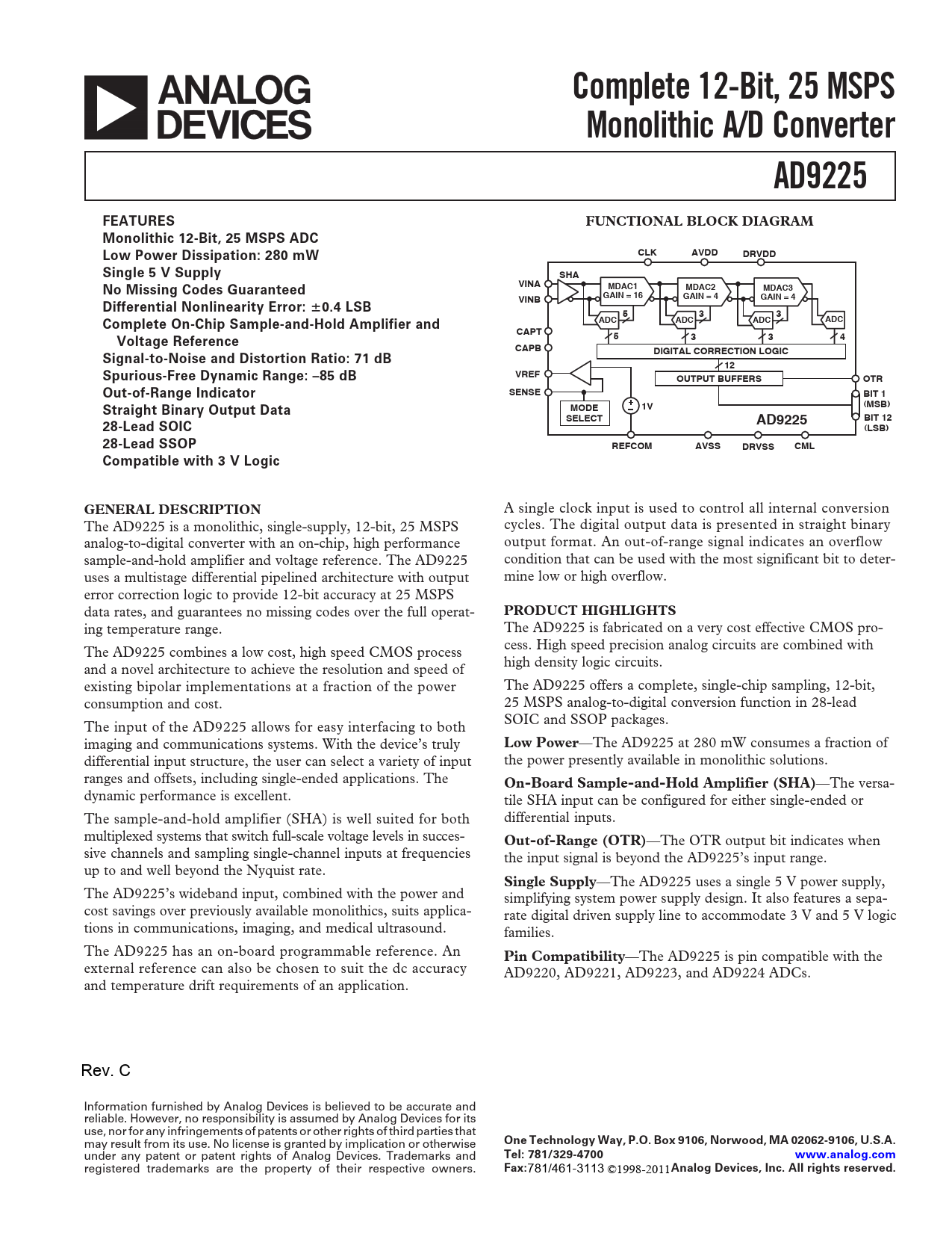 —The AD9225 is pin compatible with the external reference can also be chosen to suit the dc accuracy AD9220, AD9221, AD9223, and AD9224 ADCs. and temperature drift requirements of an application. Rev. C Information furnished by Analog Devices is believed to be accurate and reliable. However, no responsibility is assumed by Analog Devices for its use, nor for any infringements of patents or other rights of third parties that may result from its use. No license is granted by implication or otherwise