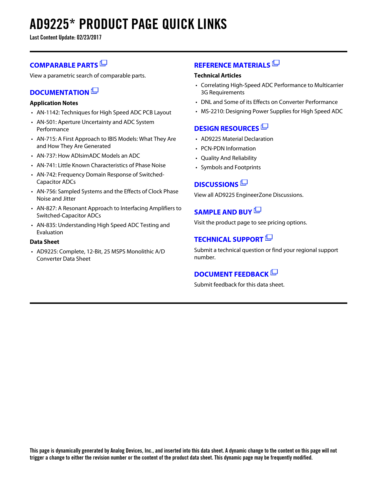 • AN-715: A First Approach to IBIS Models: What They Are • AD9225 Material Declaration and How They Are Generated • PCN-PDN Information • AN-737: How ADIsimADC Models an ADC • Quality And Reliability • AN-741: Little Known Characteristics of Phase Noise • Symbols and Footprints • AN-742: Frequency Domain Response of Switched- Capacitor ADCs