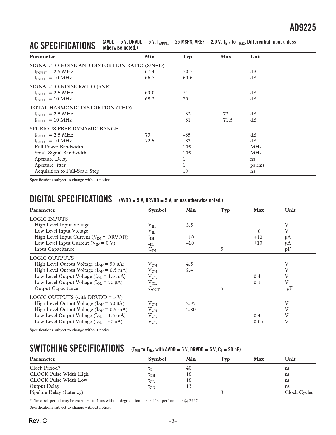 AD9225 AC SPECIFICATIONS (AVDD = 5 V, DRVDD = 5 V, fSAMPLE = 25 MSPS, VREF = 2.0 V, TMIN to TMAX, Differential Input unless otherwise noted.) Parameter Min Typ Max Unit