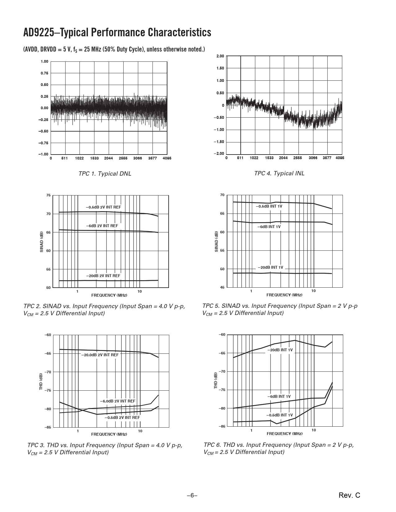 AD9225–Typical Performance Characteristics(AVDD, DRVDD = 5 V, fS = 25 MHz (50% Duty Cycle), unless otherwise noted.)2.001.001.500.751.000.500.500.2500.00Title0.50–0.25–0.501.00–0.751.50–1.002.000511102215332044255530663577409505111022153320442555306635774095TitleTITLE TPC 1. Typical DNL TPC 4. Typical INL 75700.5dB 2V INT REF0.5dB INT 1V70656dB 2V INT REF6dB INT 1V6560SINAD (dB) 60SINAD (dB) 55555020dB INT 1V20dB 2V INT REF5045110110FREQUENCY (MHz)FREQUENCY (MHz) TPC 2. SINAD vs. Input Frequency (Input Span = 4.0 V p-p, TPC 5. SINAD vs. Input Frequency (Input Span = 2 V p-p V V CM = 2.5 V Differential Input) CM = 2.5 V Differential Input) –60–6020dB INT 1V–6520.0dB 2V INT REF–65–70–70THD (dB)THD (dB)–75–756dB INT 1V6.0dB 2V INT REF–80–800.5dB INT 1V0.5dB 2V INT REF–85–85110110FREQUENCY (MHz)FREQUENCY (MHz) TPC 3. THD vs. Input Frequency (Input Span = 4.0 V p-p, TPC 6. THD vs. Input Frequency (Input Span = 2 V p-p, V V CM = 2.5 V Differential Input) CM = 2.5 V Differential Input) –6– Rev. C Document Outline FEATURES GENERAL DESCRIPTION FUNCTIONAL BLOCK DIAGRAM PRODUCT HIGHLIGHTS SPECIFICATIONS DC SPECIFICATIONS AC SPECIFICATIONS DIGITAL SPECIFICATIONS SWITCHING SPECIFICATIONS ABSOLUTE MAXIMUM RATINGS PIN CONFIGURATION PIN FUNCTION DESCRIPTIONS TERMINOLOGY Integral Nonlinearity (INL) Differential Nonlinearity (DNL, No Missing Codes) Zero Error Gain Error Temperature Drift Power Supply Rejection Aperture Jitter Aperture Delay Signal-to-Noise and Distortion Ratio (S/N+D, SINAD) Effective Number of Bits (ENOB) Total Harmonic Distortion (THD) Signal-to-Noise Ratio (SNR) Spurious-Free Dynamic Range (SFDR) TYPICAL PERFORMANCE CHARACTERISTICS INTRODUCTION ANALOG INPUT AND REFERENCE OVERVIEW ANALOG INPUT OPERATION REFERENCE OPERATION DRIVING THE ANALOG INPUTS SINGLE-ENDED MODE OF OPERATION DC COUPLING AND INTERFACE ISSUES Simple Op Amp Buffer Op Amp with DC Level Shifting AC COUPLING AND INTERFACE ISSUES Simple AC Interface Alternative AC Interface OP AMP SELECTION GUIDE DIFFERENTIAL MODE OF OPERATION REFERENCE CONFIGURATIONS USING THE INTERNAL REFERENCE Single-Ended Input with 0 to 2 3 VREF Range Resistor Programmable Reference USING AN EXTERNAL REFERENCE Variable Input Span with VCM = 2.5 V Single-Ended Input with 0 to 2 ¥ VREF Range DIGITAL INPUTS AND OUTPUTS Digital Outputs Out-Of-Range (OTR) Digital Output Driver Considerations (DRVDD) Clock Input and Considerations Direct IF Down Conversion Using the AD9225 GROUNDING AND DECOUPLING Analog and Digital Grounding Analog and Digital Driver Supply Decoupling OUTLINE DIMENSIONS Ordering Guide REVISION HISTORY