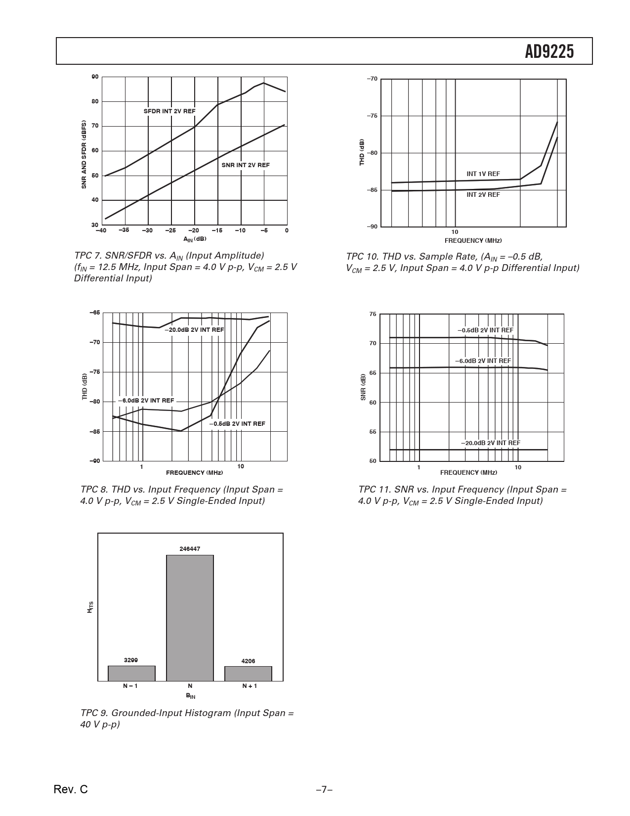 AD9225 –70 SFDR INT 2V REF –75 –80 SNR INT 2V REF THD (dB) INT 1V REF SNR AND SFDR (dBFS) –85 INT 2V REF –90 –40 –35 –30 –25 –20 –15 –10