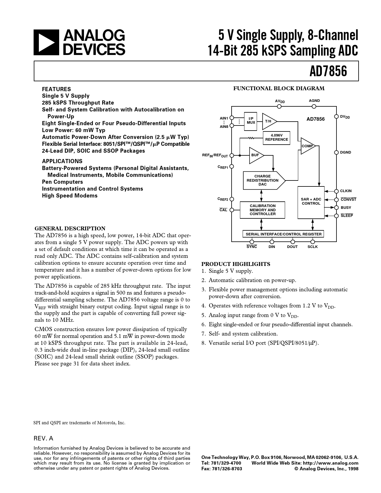 5 V Single Supply, 8-Channel 14-Bit 285 kSPS Sampling ADC AD7856 FEATURES FUNCTIONAL BLOCK DIAGRAM Single 5␣ V Supply AVDD AGND 285 kSPS Throughput Rate Self- and System Calibration with Autocalibration on Power-Up DV ... DD AIN1 .. I/P AD7856 T/H MUX Eight Single-Ended or Four Pseudo-Differential Inputs AIN8 Low Power: 60 mW Typ 4.096V Automatic Power-Down After Conversion (2.5␣