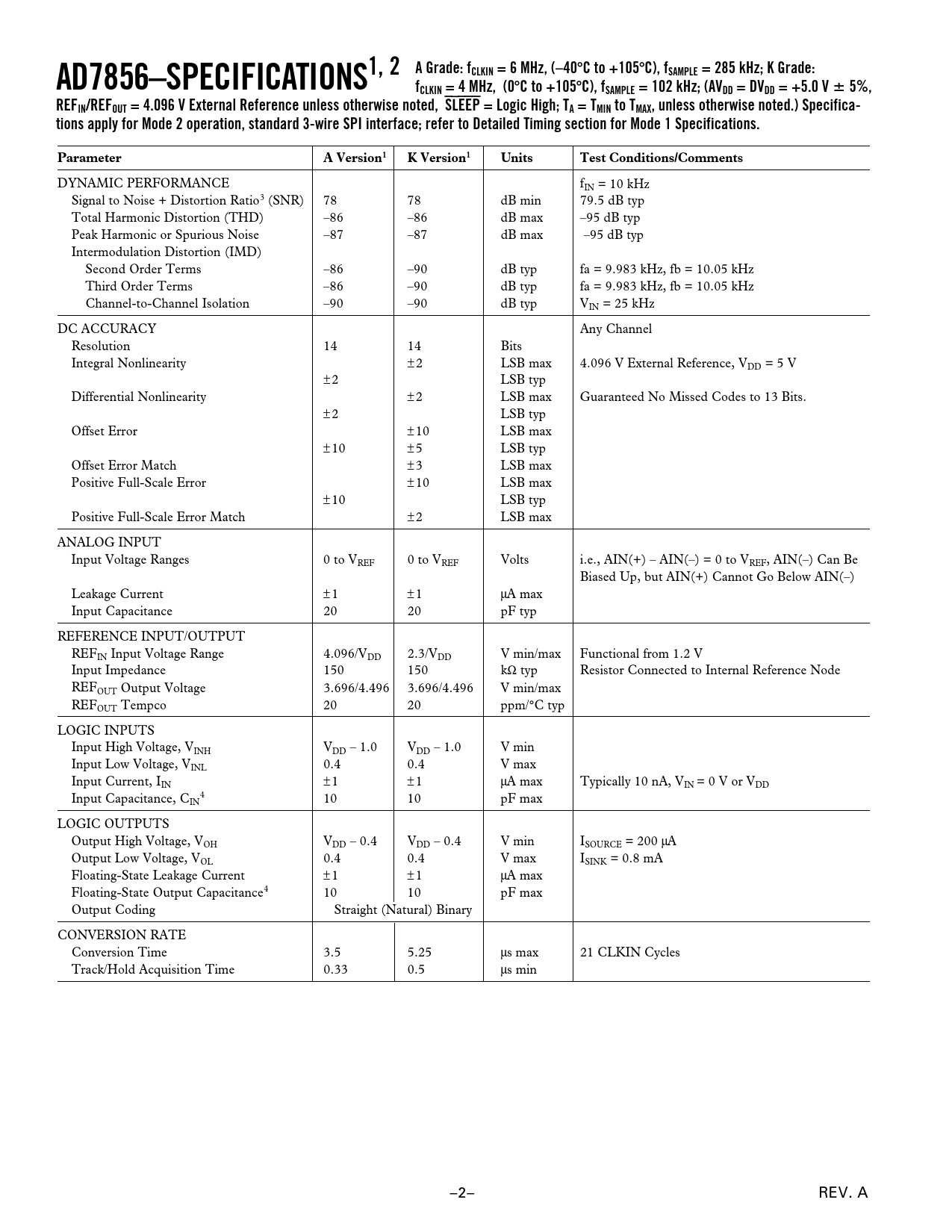 AD7856–SPECIFICATIONS1, 2 A Grade: fCLKIN = 6 MHz, (–40 C to +105 C), fSAMPLE = 285 kHz; K Grade: fCLKIN = 4 MHz, (0