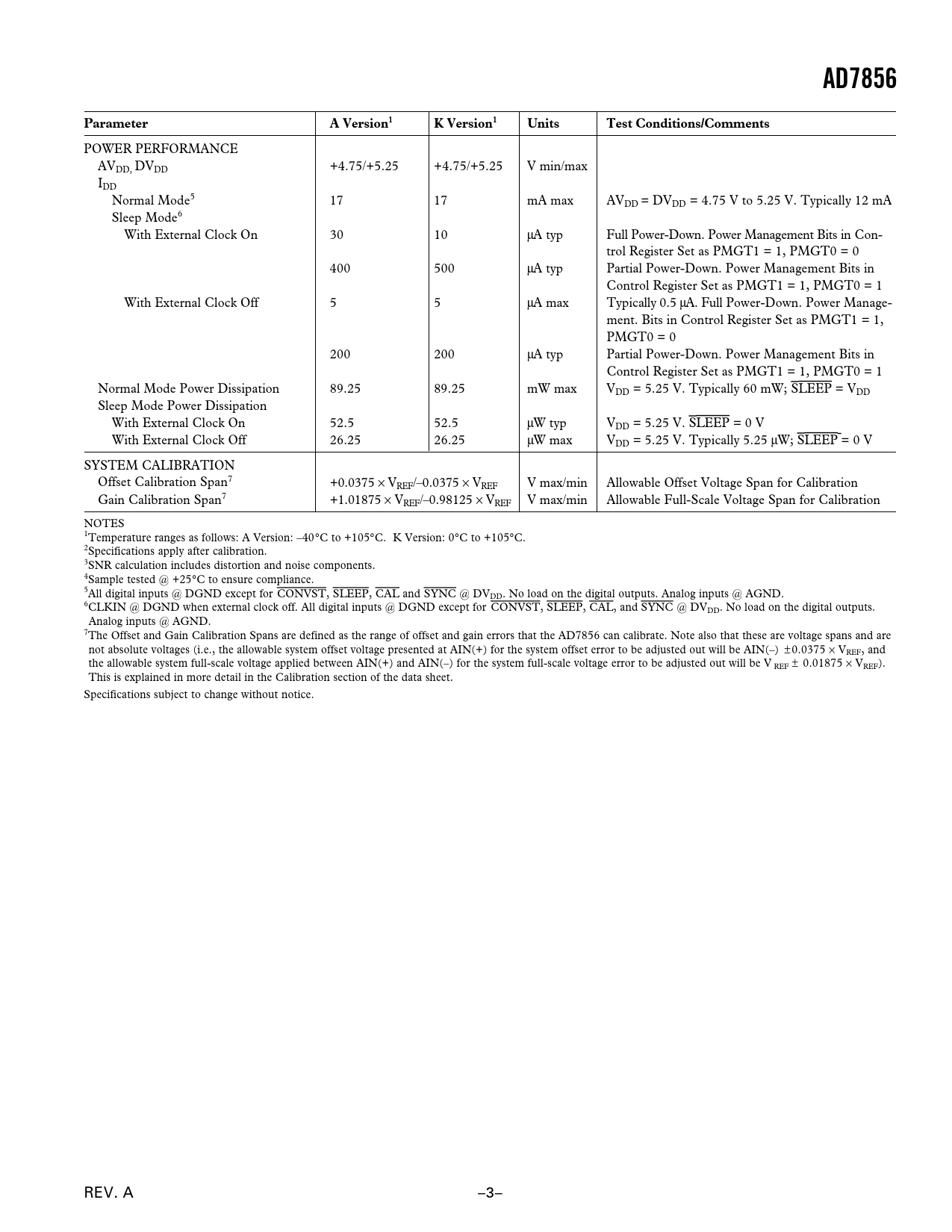 AD7856ParameterA Version1K Version1UnitsTest Conditions/Comments POWER PERFORMANCE AVDD, DVDD +4.75/+5.25 +4.75/+5.25 V min/max IDD Normal Mode5 17 17 mA max AVDD = DVDD = 4.75 V to 5.25 V. Typically 12 mA Sleep Mode6 With External Clock On 30 10 µA typ Full Power-Down. Power Management Bits in Con- trol Register Set as PMGT1 = 1, PMGT0 = 0 400 500 µA typ Partial Power-Down. Power Management Bits in Control Register Set as PMGT1 = 1, PMGT0 = 1 With External Clock Off 5 5 µA max Typically 0.5 µA. Full Power-Down. Power Manage- ment. Bits in Control Register Set as PMGT1 = 1, PMGT0 = 0 200 200 µA typ Partial Power-Down. Power Management Bits in Control Register Set as PMGT1 = 1, PMGT0 = 1 Normal Mode Power Dissipation 89.25 89.25 mW max VDD = 5.25 V. Typically 60 mW; SLEEP = VDD Sleep Mode Power Dissipation With External Clock On 52.5 52.5 µW typ VDD = 5.25 V. SLEEP = 0 V With External Clock Off 26.25 26.25 µW max VDD = 5.25 V. Typically 5.25 µW; SLEEP = 0 V SYSTEM CALIBRATION Offset Calibration Span7 +0.0375 × VREF/–0.0375 × VREF V max/min Allowable Offset Voltage Span for Calibration Gain Calibration Span7 +1.01875 × VREF/–0.98125 × VREF V max/min Allowable Full-Scale Voltage Span for Calibration NOTES 1Temperature ranges as follows: A Version: –40°C to +105°C. K Version: 0°C to +105°C. 2Specifications apply after calibration. 3SNR calculation includes distortion and noise components. 4Sample tested @ +25°C to ensure compliance. 5All digital inputs @ DGND except for CONVST, SLEEP, CAL and SYNC @ DVDD. No load on the digital outputs. Analog inputs @ AGND. 6CLKIN @ DGND when external clock off. All digital inputs @ DGND except for CONVST, SLEEP, CAL, and SYNC @ DVDD. No load on the digital outputs. Analog inputs @ AGND. 7The Offset and Gain Calibration Spans are defined as the range of offset and gain errors that the AD7856 can calibrate. Note also that these are voltage spans and are not absolute voltages (i.e., the allowable system offset voltage presented at AIN(+) for the system offset error to be adjusted out will be AIN(–) ± 0.0375 × VREF, and the allowable system full-scale voltage applied between AIN(+) and AIN(–) for the system full-scale voltage error to be adjusted out will be V REF ± 0.01875 × VREF). This is explained in more detail in the Calibration section of the data sheet. Specifications subject to change without notice. REV. A –3–