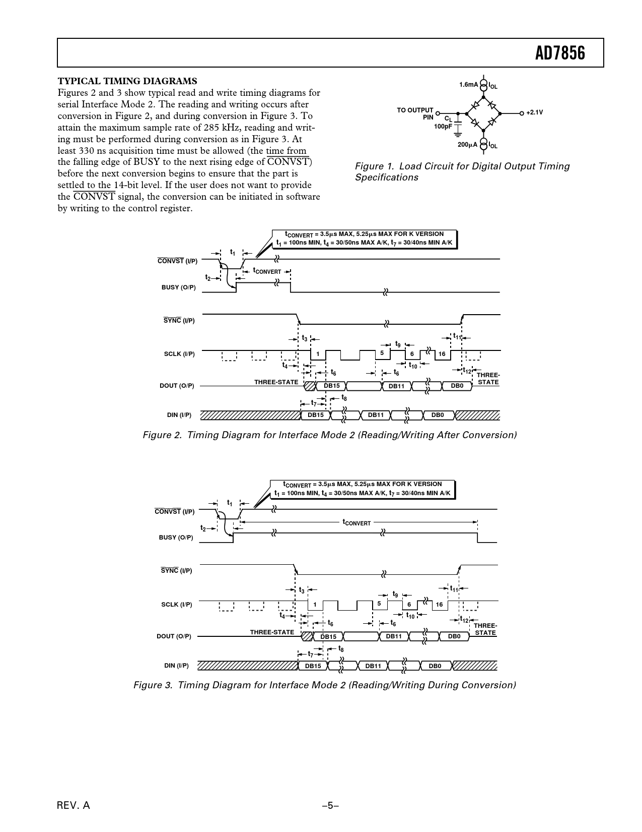 AD7856TYPICAL TIMING DIAGRAMS1.6mAIOL Figures 2 and 3 show typical read and write timing diagrams for serial Interface Mode 2. The reading and writing occurs after TO OUTPUT conversion in Figure 2, and during conversion in Figure 3. To +2.1VPINCL attain the maximum sample rate of 285 kHz, reading and writ- 100pF ing must be performed during conversion as in Figure 3. At 200 m AI least 330 ns acquisition time must be allowed (the time from OL the falling edge of BUSY to the next rising edge of CONVST) Figure 1. Load Circuit for Digital Output Timing before the next conversion begins to ensure that the part is Specifications settled to the 14-bit level. If the user does not want to provide the CONVST signal, the conversion can be initiated in software by writing to the control register. tCONVERT = 3.5 m s MAX, 5.25 m s MAX FOR K VERSIONt1 = 100ns MIN, t4 = 30/50ns MAX A/K, t7 = 30/40ns MIN A/Kt1CONVST (I/P)tCONVERTt2BUSY (O/P)SYNC (I/P)tt311t9SCLK (I/P)15616t4t10tt6t612THREE-THREE-STATESTATEDOUT (O/P)DB15DB11DB0t8t7DIN (I/P)DB15DB11DB0 Figure 2. Timing Diagram for Interface Mode 2 (Reading/Writing After Conversion) tCONVERT = 3.5 m s MAX, 5.25 m s MAX FOR K VERSIONt1 = 100ns MIN, t4 = 30/50ns MAX A/K, t7 = 30/40ns MIN A/Kt1CONVST (I/P)tCONVERTt2BUSY (O/P)SYNC (I/P)tt311t9SCLK (I/P)15616t4t10tt126t6THREE-THREE-STATESTATEDOUT (O/P)DB15DB11DB0t8t7DIN (I/P)DB15DB11DB0 Figure 3. Timing Diagram for Interface Mode 2 (Reading/Writing During Conversion) REV. A –5–