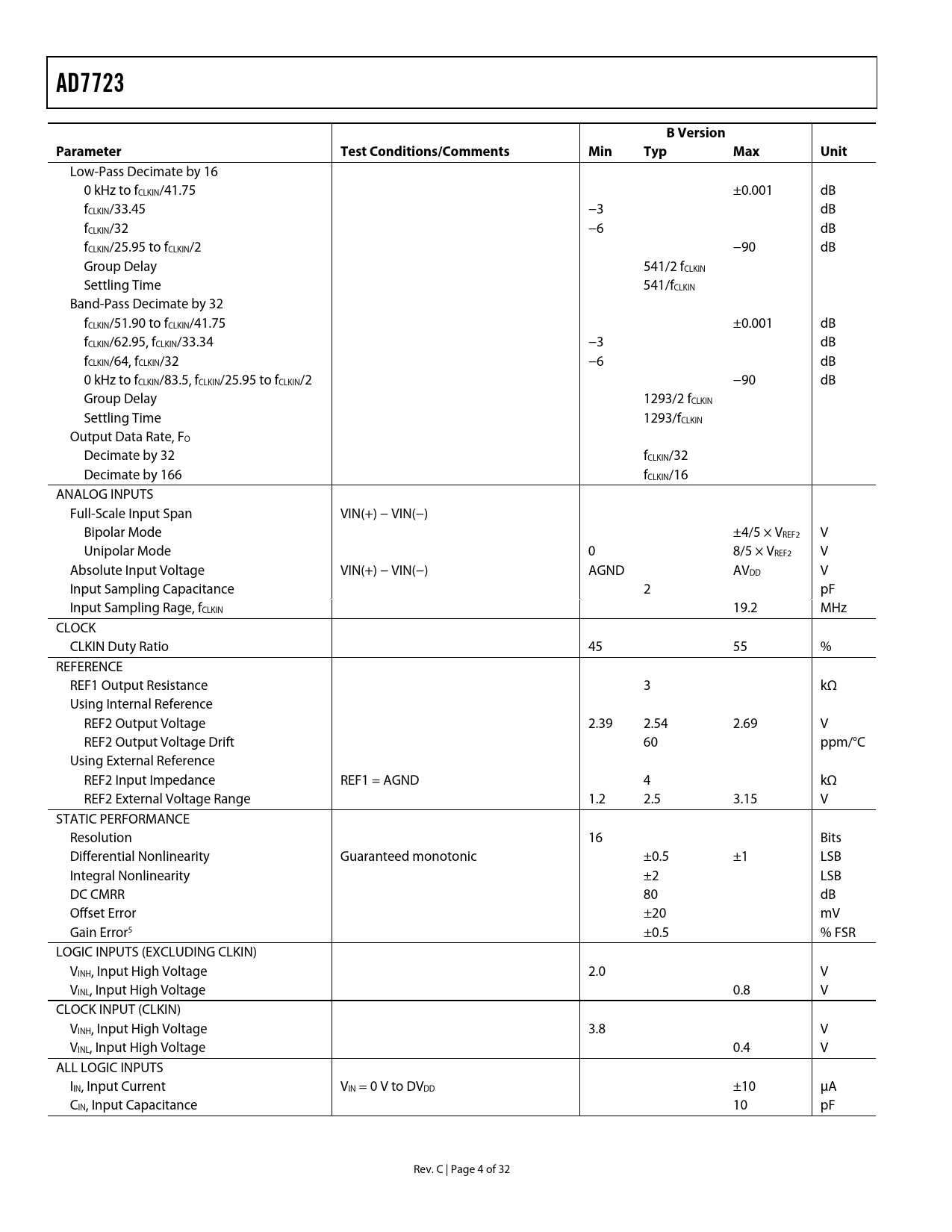 link to page 6 AD7723BVersionParameter TestConditions/CommentsMinTypMaxUnit Low-Pass Decimate by 16 0 kHz to fCLKIN/41.75 ±0.001 dB fCLKIN/33.45 −3 dB fCLKIN/32 −6 dB fCLKIN/25.95 to fCLKIN/2 −90 dB Group Delay 541/2 fCLKIN Settling Time 541/fCLKIN Band-Pass Decimate by 32 fCLKIN/51.90 to fCLKIN/41.75 ±0.001 dB fCLKIN/62.95, fCLKIN/33.34 −3 dB fCLKIN/64, fCLKIN/32 −6 dB 0 kHz to fCLKIN/83.5, fCLKIN/25.95 to fCLKIN/2 −90 dB Group Delay 1293/2 fCLKIN Settling Time 1293/fCLKIN Output Data Rate, FO Decimate by 32 fCLKIN/32 Decimate by 166 fCLKIN/16 ANALOG INPUTS Full-Scale Input Span VIN(+) − VIN(−) Bipolar Mode ±4/5 × VREF2 V Unipolar Mode 0 8/5 × VREF2 V Absolute Input Voltage VIN(+) − VIN(−) AGND AVDD V Input Sampling Capacitance 2 pF Input Sampling Rage, fCLKIN 19.2 MHz CLOCK CLKIN Duty Ratio 45 55 % REFERENCE REF1 Output Resistance 3 kΩ Using Internal Reference REF2 Output Voltage 2.39 2.54 2.69 V REF2 Output Voltage Drift 60 ppm/°C Using External Reference REF2 Input Impedance REF1 = AGND 4 kΩ REF2 External Voltage Range 1.2 2.5 3.15 V STATIC PERFORMANCE Resolution 16 Bits Differential Nonlinearity Guaranteed monotonic ±0.5 ±1 LSB Integral Nonlinearity ±2 LSB DC CMRR 80 dB Offset Error ±20 mV Gain Error5 ±0.5 % FSR LOGIC INPUTS (EXCLUDING CLKIN) VINH, Input High Voltage 2.0 V VINL, Input High Voltage 0.8 V CLOCK INPUT (CLKIN) VINH, Input High Voltage 3.8 V VINL, Input High Voltage 0.4 V ALL LOGIC INPUTS IIN, Input Current VIN = 0 V to DVDD ±10 µA CIN, Input Capacitance 10 pF Rev. C | Page 4 of 32 Document Outline FEATURES GENERAL DESCRIPTION FUNCTIONAL BLOCK DIAGRAM TABLE OF CONTENTS REVISION HISTORY SPECIFICATIONS TIMING SPECIFICATIONS ABSOLUTE MAXIMUM RATINGS ESD CAUTION PIN CONFIGURATION AND FUNCTION DESCRIPTIONS TERMINOLOGY TYPICAL PERFORMANCE CHARACTERISTICS CIRCUIT DESCRIPTION APPLYING THE AD7723 ANALOG INPUT RANGE ANALOG INPUT DRIVING THE ANALOG INPUTS APPLYING THE REFERENCE CLOCK GENERATION SYSTEM SYNCHRONIZATION DATA INTERFACING PARALLEL INTERFACE SERIAL INTERFACE TWO-CHANNEL MULTIPLEXED OPERATION SERIAL INTERFACE TO DSPs AD7723 TO ADSP-21xx INTERFACE AD7723 TO SHARC INTERFACE AD7723 TO DSP56002 INTERFACE AD7723 TO TMS320C5x INTERFACE GROUNDING AND LAYOUT OUTLINE DIMENSIONS ORDERING GUIDE