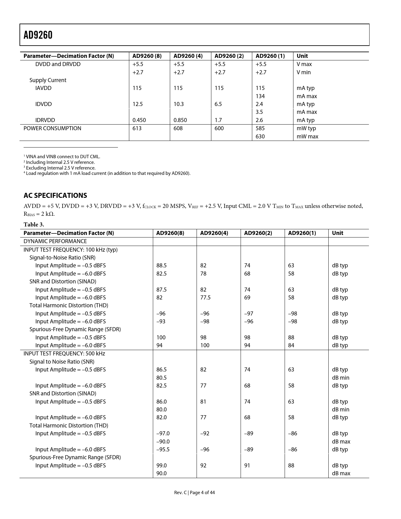 AD9260. Parameter—Decimation Factor (N). AD9260 (8). AD9260 (4). AD9260 (2). AD9260 (1). Unit. AC SPECIFICATIONS