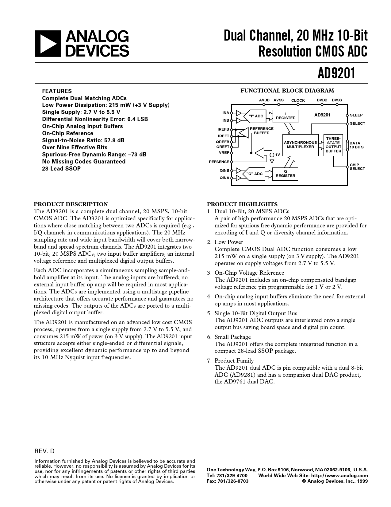 Dual Channel, 20 MHz 10-Bit Resolution CMOS ADC AD9201 FEATURES FUNCTIONAL BLOCK DIAGRAM Complete Dual Matching ADCs AVDD AVSS CLOCK DVDD DVSS Low Power Dissipation: 215 mW (+3 V Supply) Single Supply: 2.7 V to 5.5 V IINA I "I" ADC AD9201 SLEEP Differential Nonlinearity Error: 0.4 LSB REGISTER IINB SELECT On-Chip Analog Input Buffers IREFB REFERENCE On-Chip Reference BUFFER IREFT Signal-to-Noise Ratio: 57.8 dB THREE- QREFB ASYNCHRONOUS STATE DATA Over Nine Effective Bits QREFT MULTIPLEXER OUTPUT 10 BITS BUFFER Spurious-Free Dynamic Range: –73 dB VREF 1V No Missing Codes Guaranteed REFSENSE CHIP 28-Lead SSOP QINB SELECT Q "Q" ADC REGISTER QINA PRODUCT DESCRIPTION PRODUCT HIGHLIGHTS