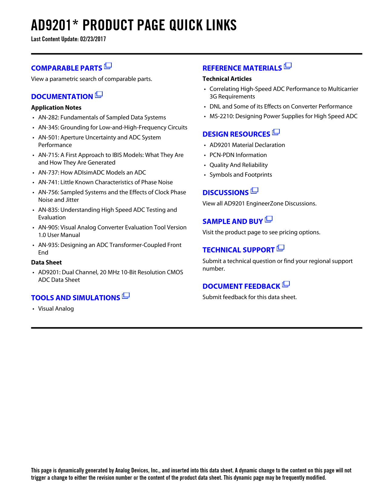 AD9201* PRODUCT PAGE QUICK LINKS Last Content Update: 02/23/2017COMPARABLE PARTSREFERENCE MATERIALS View a parametric search of comparable parts. Technical Articles • Correlating High-Speed ADC Performance to Multicarrier DOCUMENTATION 3G Requirements Application Notes • DNL and Some of its Effects on Converter Performance • AN-282: Fundamentals of Sampled Data Systems • MS-2210: Designing Power Supplies for High Speed ADC • AN-345: Grounding for Low-and-High-Frequency Circuits • AN-501: Aperture Uncertainty and ADC System DESIGN RESOURCES Performance • AD9201 Material Declaration • AN-715: A First Approach to IBIS Models: What They Are • PCN-PDN Information and How They Are Generated • Quality And Reliability • AN-737: How ADIsimADC Models an ADC • Symbols and Footprints • AN-741: Little Known Characteristics of Phase Noise • AN-756: Sampled Systems and the Effects of Clock Phase DISCUSSIONS Noise and Jitter View all AD9201 EngineerZone Discussions. • AN-835: Understanding High Speed ADC Testing and Evaluation SAMPLE AND BUY • AN-905: Visual Analog Converter Evaluation Tool Version 1.0 User Manual Visit the product page to see pricing options. • AN-935: Designing an ADC Transformer-Coupled Front End TECHNICAL SUPPORTData Sheet Submit a technical question or find your regional support number. • AD9201: Dual Channel, 20 MHz 10-Bit Resolution CMOS ADC Data Sheet DOCUMENT FEEDBACKTOOLS AND SIMULATIONS Submit feedback for this data sheet. • Visual Analog This page is dynamically generated by Analog Devices, Inc., and inserted into this data sheet. A dynamic change to the content on this page will not trigger a change to either the revision number or the content of the product data sheet. This dynamic page may be frequently modified.