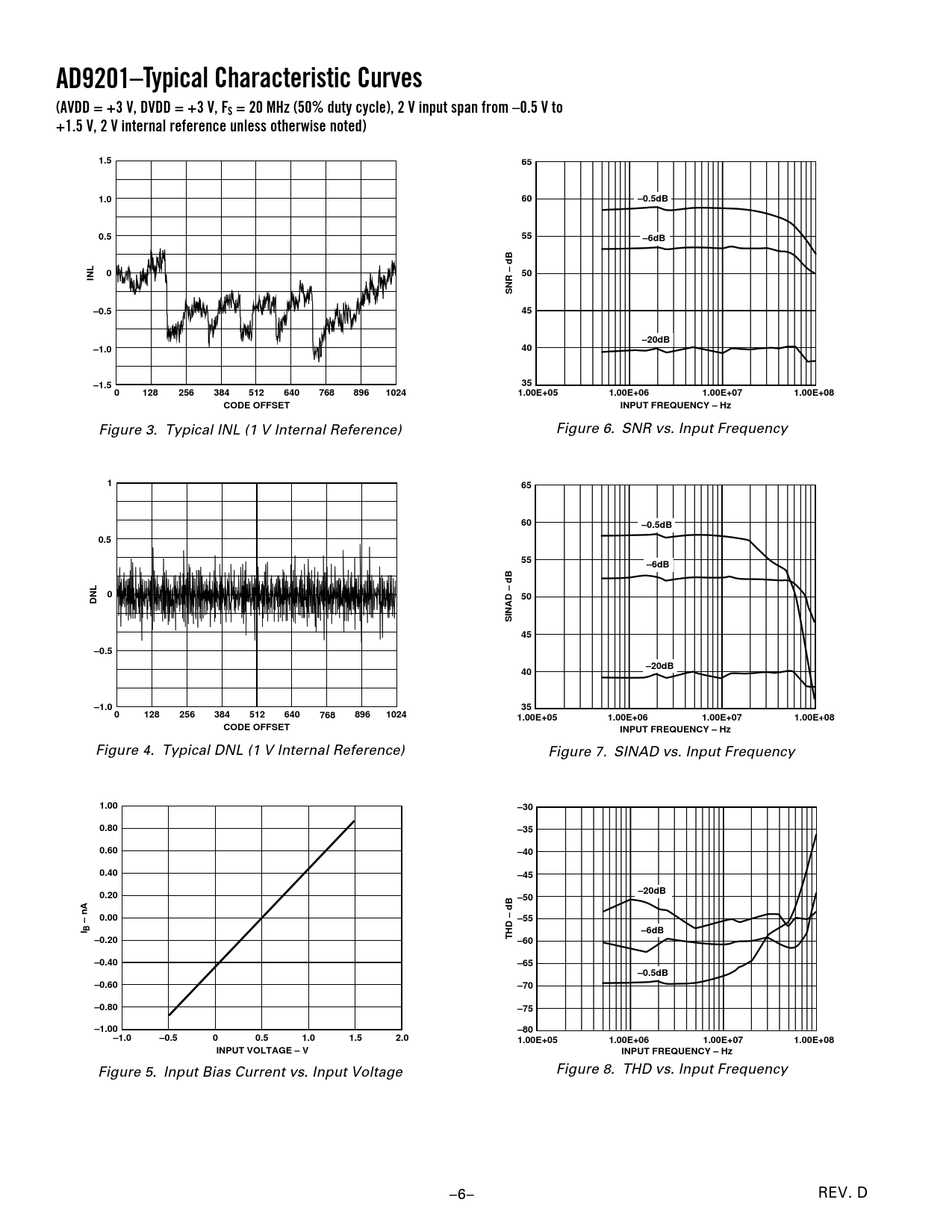 AD9201–Typical Characteristic Curves (AVDD = +3 V, DVDD = +3 V, FS = 20 MHz (50% duty cycle), 2 V input span from –0.5 V to +1.5 V, 2 V internal reference unless otherwise noted) 1.5 65 1.0 60 –0.5dB 0.5 55 –6dB 0 INL 50 SNR – dB –0.5 45 –20dB –1.0 40 –1.5 35 0 128 256 384 512 640 768 896 1024 1.00E+05 1.00E+06 1.00E+07 1.00E+08 CODE OFFSET INPUT FREQUENCY – Hz