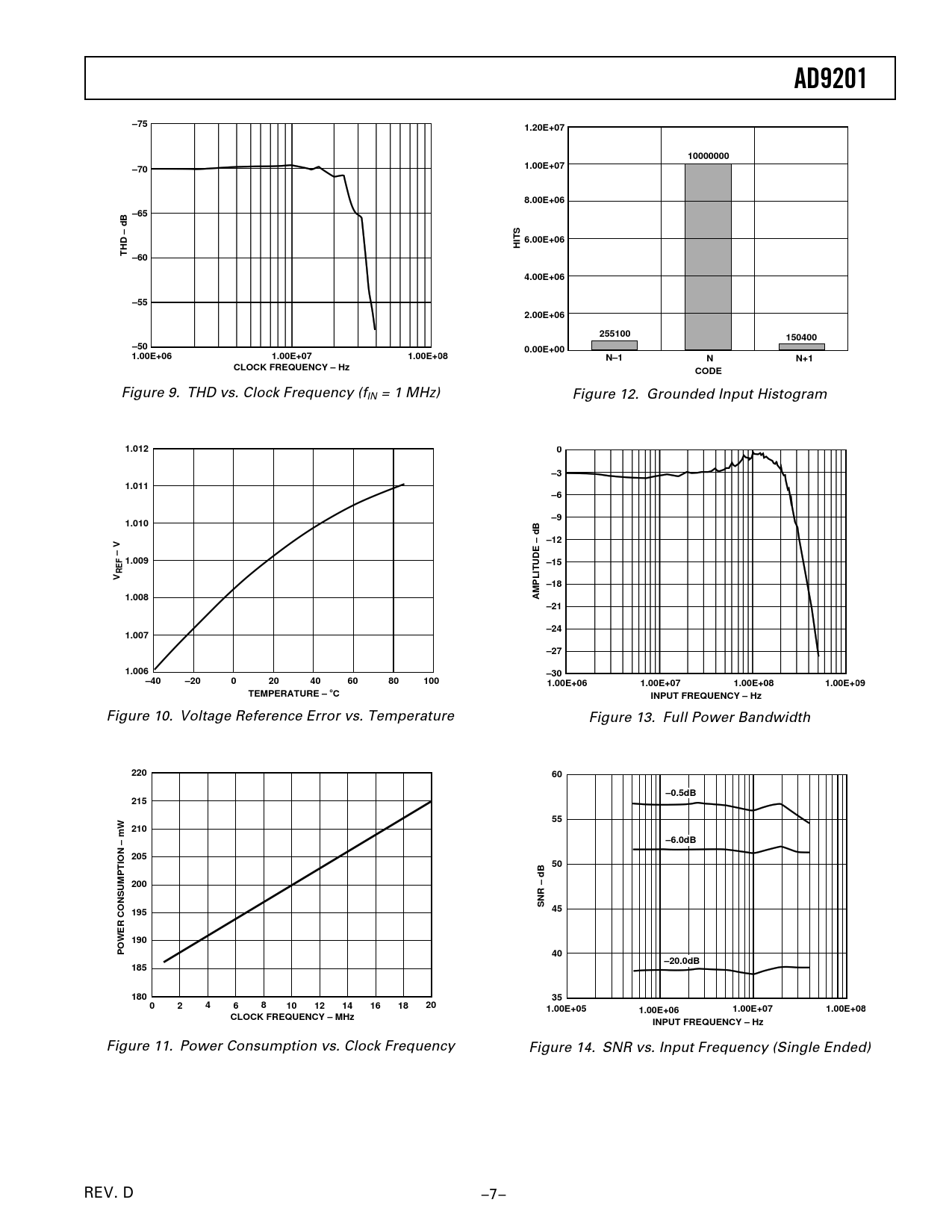 AD9201 –75 1.20E+07 10000000 –70 1.00E+07 8.00E+06 –65 6.00E+06 HITS THD – dB –60 4.00E+06 –55 2.00E+06 255100 150400 –50 0.00E+00 1.00E+06 1.00E+07 1.00E+08 N–1 N N+1 CLOCK FREQUENCY – Hz CODE