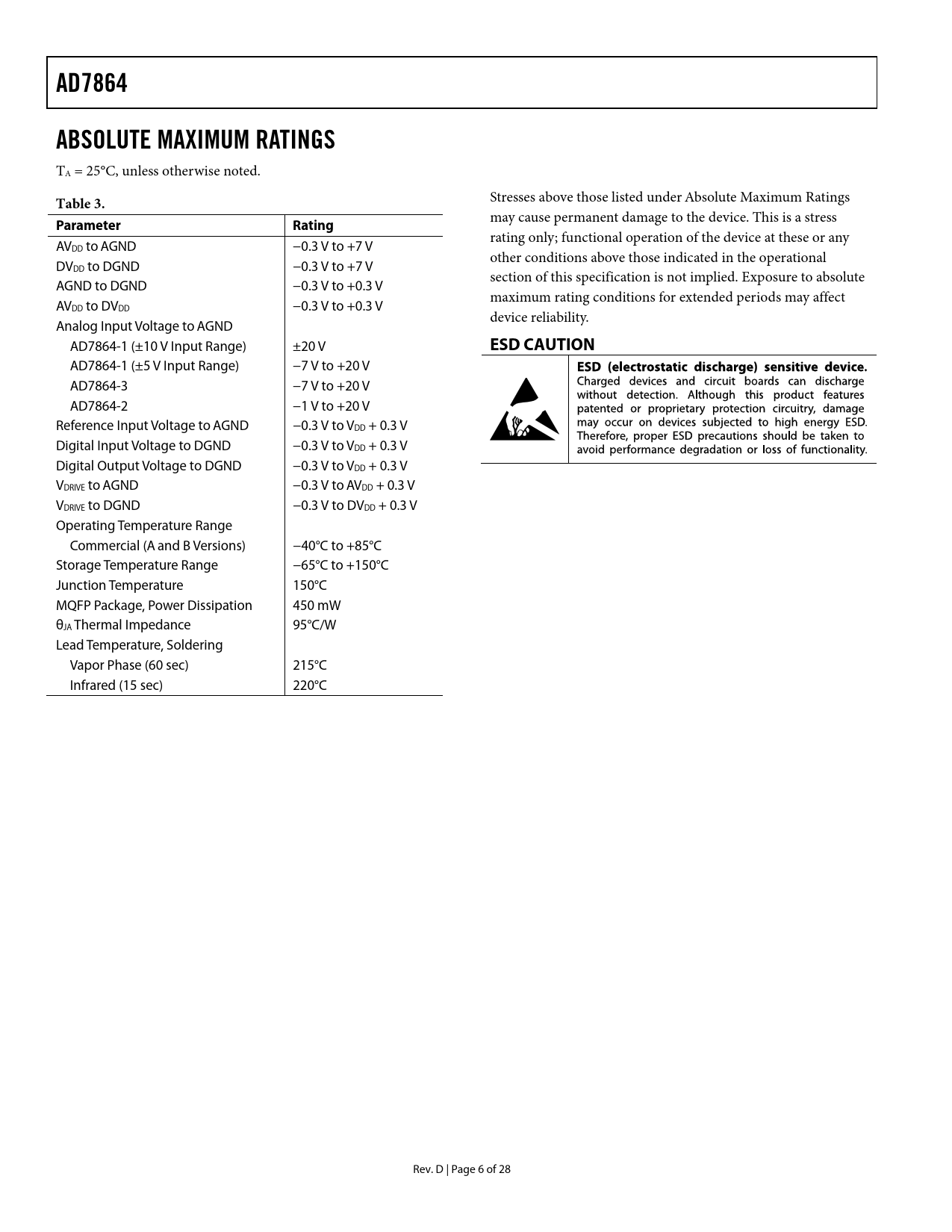 页数 / 页29 / 7 — AD7864. ABSOLUTE MAXIMUM RATINGS. Table 3. Parameter Rating. ESD CAUTION