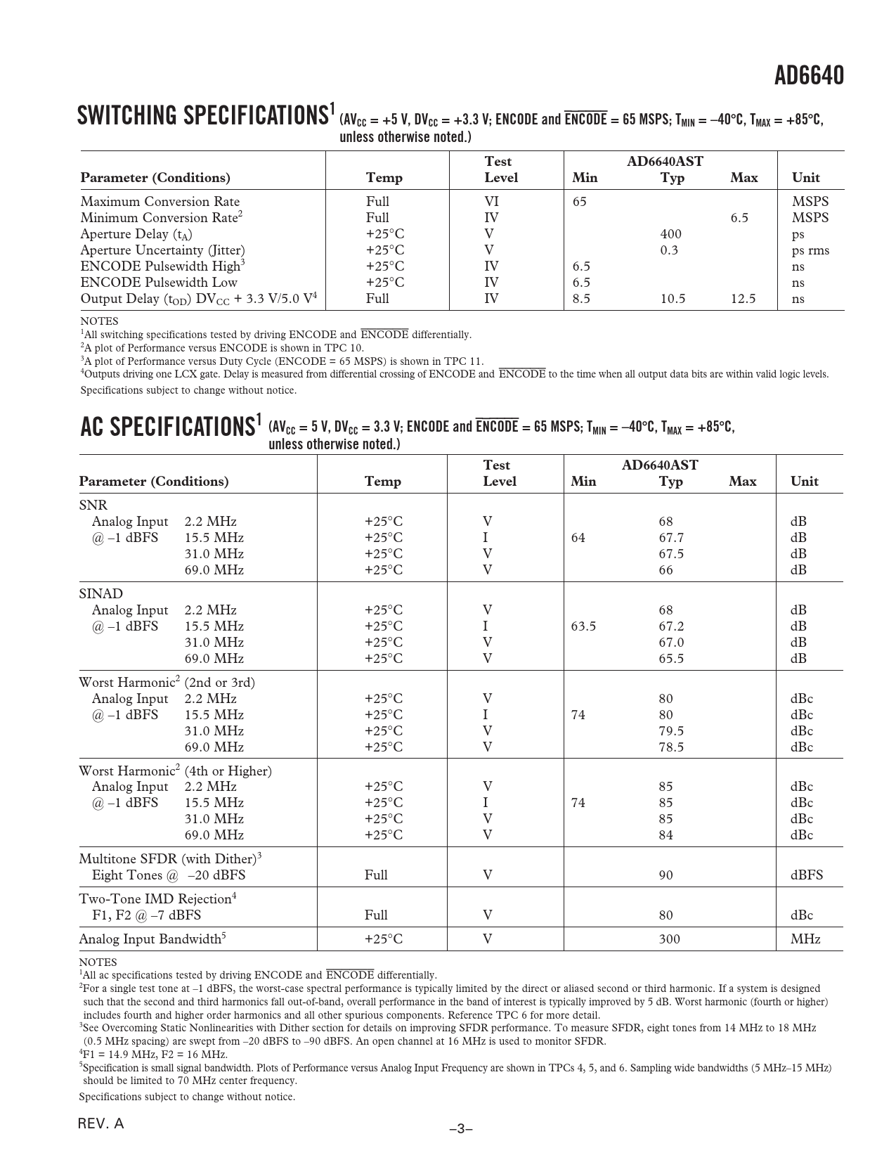 AD6640SWITCHING SPECIFICATIONS1 (AVCC = +5 V, DVCC = +3.3 V; ENCODE and ENCODE = 65 MSPS; TMIN = –40 ⴗ C, TMAX = +85 ⴗ C,unless otherwise noted.)TestAD6640ASTParameter (Conditions)TempLevelMinTypMaxUnit Maximum Conversion Rate Full VI 65 MSPS Minimum Conversion Rate2 Full IV 6.5 MSPS Aperture Delay (tA) +25°C V 400 ps Aperture Uncertainty (Jitter) +25°C V 0.3 ps rms ENCODE Pulsewidth High3 +25°C IV 6.5 ns ENCODE Pulsewidth Low +25°C IV 6.5 ns Output Delay (tOD) DVCC + 3.3 V/5.0 V4 Full IV 8.5 10.5 12.5 ns NOTES 1All switching specifications tested by driving ENCODE and ENCODE differentially. 2A plot of Performance versus ENCODE is shown in TPC 10. 3A plot of Performance versus Duty Cycle (ENCODE = 65 MSPS) is shown in TPC 11. 4Outputs driving one LCX gate. Delay is measured from differential crossing of ENCODE and ENCODE to the time when all output data bits are within valid logic levels. Specifications subject to change without notice. (AVAC SPECIFICATIONS1 CC = 5 V, DVCC = 3.3 V; ENCODE and ENCODE = 65 MSPS; TMIN = –40 ⴗ C, TMAX = +85 ⴗ C,unless otherwise noted.)TestAD6640ASTParameter (Conditions)TempLevelMinTypMaxUnit SNR Analog Input 2.2 MHz +25°C V 68 dB @ –1 dBFS 15.5 MHz +25°C I 64 67.7 dB 31.0 MHz +25°C V 67.5 dB 69.0 MHz +25°C V 66 dB SINAD Analog Input 2.2 MHz +25°C V 68 dB @ –1 dBFS 15.5 MHz +25°C I 63.5 67.2 dB 31.0 MHz +25°C V 67.0 dB 69.0 MHz +25°C V 65.5 dB Worst Harmonic2 (2nd or 3rd) Analog Input 2.2 MHz +25°C V 80 dBc @ –1 dBFS 15.5 MHz +25°C I 74 80 dBc 31.0 MHz +25°C V 79.5 dBc 69.0 MHz +25°C V 78.5 dBc Worst Harmonic2 (4th or Higher) Analog Input 2.2 MHz +25°C V 85 dBc @ –1 dBFS 15.5 MHz +25°C I 74 85 dBc 31.0 MHz +25°C V 85 dBc 69.0 MHz +25°C V 84 dBc Multitone SFDR (with Dither)3 Eight Tones @ –20 dBFS Full V 90 dBFS Two-Tone IMD Rejection4 F1, F2 @ –7 dBFS Full V 80 dBc Analog Input Bandwidth5 +25°C V 300 MHz NOTES 1All ac specifications tested by driving ENCODE and ENCODE differentially. 2For a single test tone at –1 dBFS, the worst-case spectral performance is typically limited by the direct or aliased second or third harmonic. If a system is designed such that the second and third harmonics fall out-of-band, overall performance in the band of interest is typically improved by 5 dB. Worst harmonic (fourth or higher) includes fourth and higher order harmonics and all other spurious components. Reference TPC 6 for more detail. 3See Overcoming Static Nonlinearities with Dither section for details on improving SFDR performance. To measure SFDR, eight tones from 14 MHz to 18 MHz (0.5 MHz spacing) are swept from –20 dBFS to –90 dBFS. An open channel at 16 MHz is used to monitor SFDR. 4F1 = 14.9 MHz, F2 = 16 MHz. 5Specification is small signal bandwidth. Plots of Performance versus Analog Input Frequency are shown in TPCs 4, 5, and 6. Sampling wide bandwidths (5 MHz–15 MHz) should be limited to 70 MHz center frequency. Specifications subject to change without notice. REV. A –3– Document Outline FEATURES APPLICATIONS GENERAL DESCRIPTION FUNCTIONAL BLOCK DIAGRAM PRODUCT HIGHLIGHTS SPECIFICATIONS DC SPECIFICATIONS DIGITAL SPECIFICATIONS SWITCHING SPECIFICATIONS AC SPECIFICATIONS ABSOLUTE MAXIMUM RATINGS EXPLANATION OF TEST LEVELS ORDERING GUIDE PIN FUNCTION DESCRIPTIONS PIN CONFIGURATION DEFINITION OF SPECIFICATIONS Analog Bandwidth (Small Signal) Aperture Delay Aperture Uncertainty (Jitter) Differential Nonlinearity Encode Pulsewidth/Duty Cycle Integral Nonlinearity Minimum Conversion Rate Maximum Conversion Rate Output Propagation Delay Power Supply Rejection Ratio Signal-to-Noise-and-Distortion (SINAD) Signal-to-Noise Ratio (SNR) Spurious-Free Dynamic Range (SFDR) Two-Tone Intermodulation Distortion Rejection Two-Tone SFDR Worst Harmonic Equivalent Circuits Typical Performance Characteristics THEORY OF OPERATION APPLYING THE AD6640 Encoding the AD6640 Driving the Analog Input Power Supplies Output Loading Layout Information Evaluation Boards DIGITAL WIDEBAND RECEIVERS Introduction System Description System Requirements Noise Floor and SNR Processing Gain Overcoming Static Nonlinearities with Dither Receiver Example IF Sampling Using the AD6640 as a Mix-Down Stage RECEIVE CHAIN FOR A PHASED-ARRAY CELLULAR BASE STATION OUTLINE DIMENSIONS Revision History